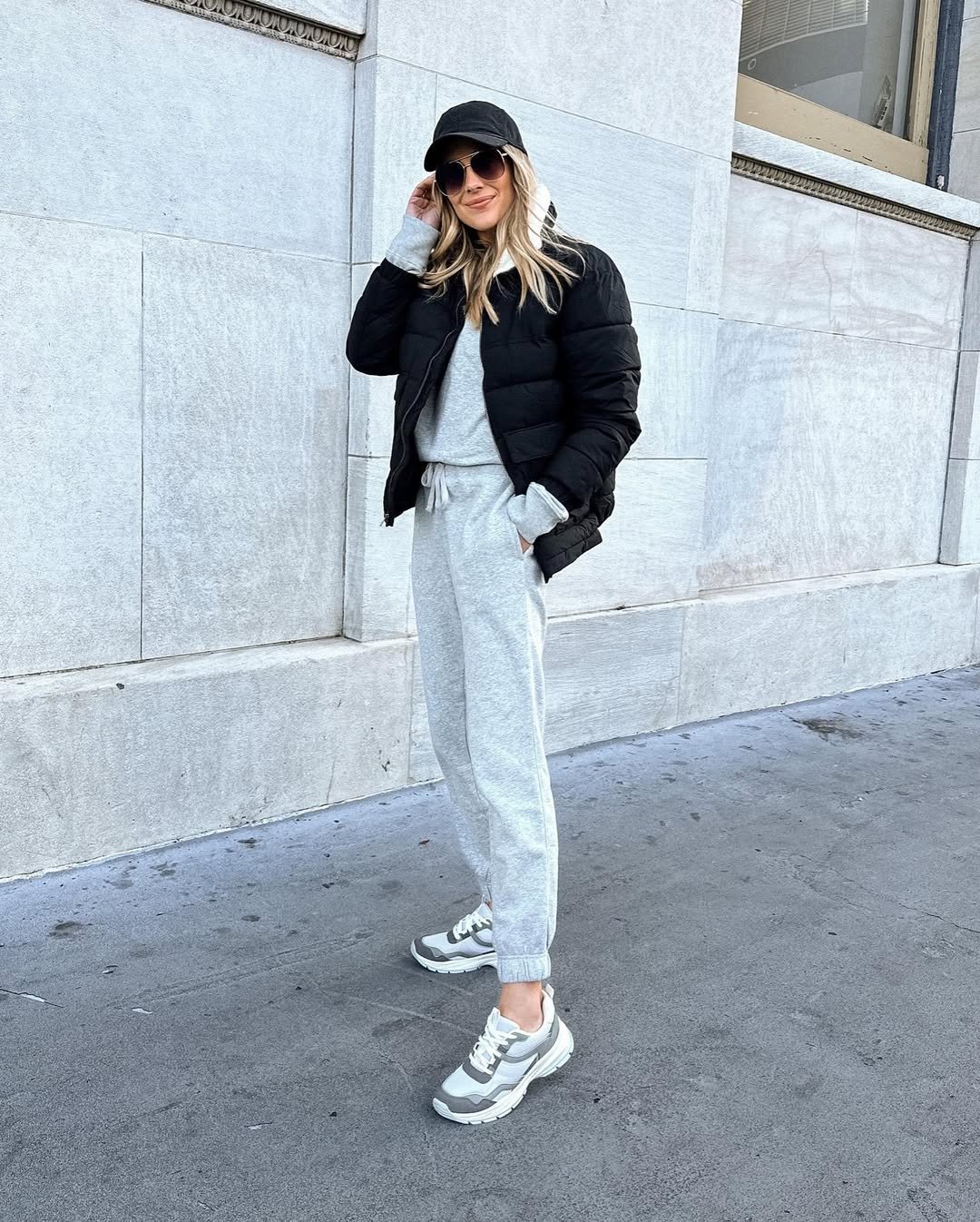 A grey sweatsuit always delivers, but the black puffer jacket adds just the right amount of structure. The layered look feels warm, clean, and easy without ever drifting into overly casual territory.