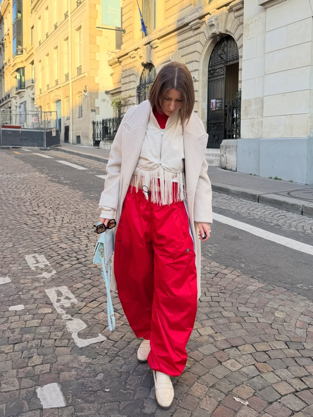 Some outfits just wake up a whole street, and these bold red track pants definitely understood the assignment. The silky shine paired with soft neutral layers on top keeps the look balanced — a little sporty, a little polished, and very street-style ready.