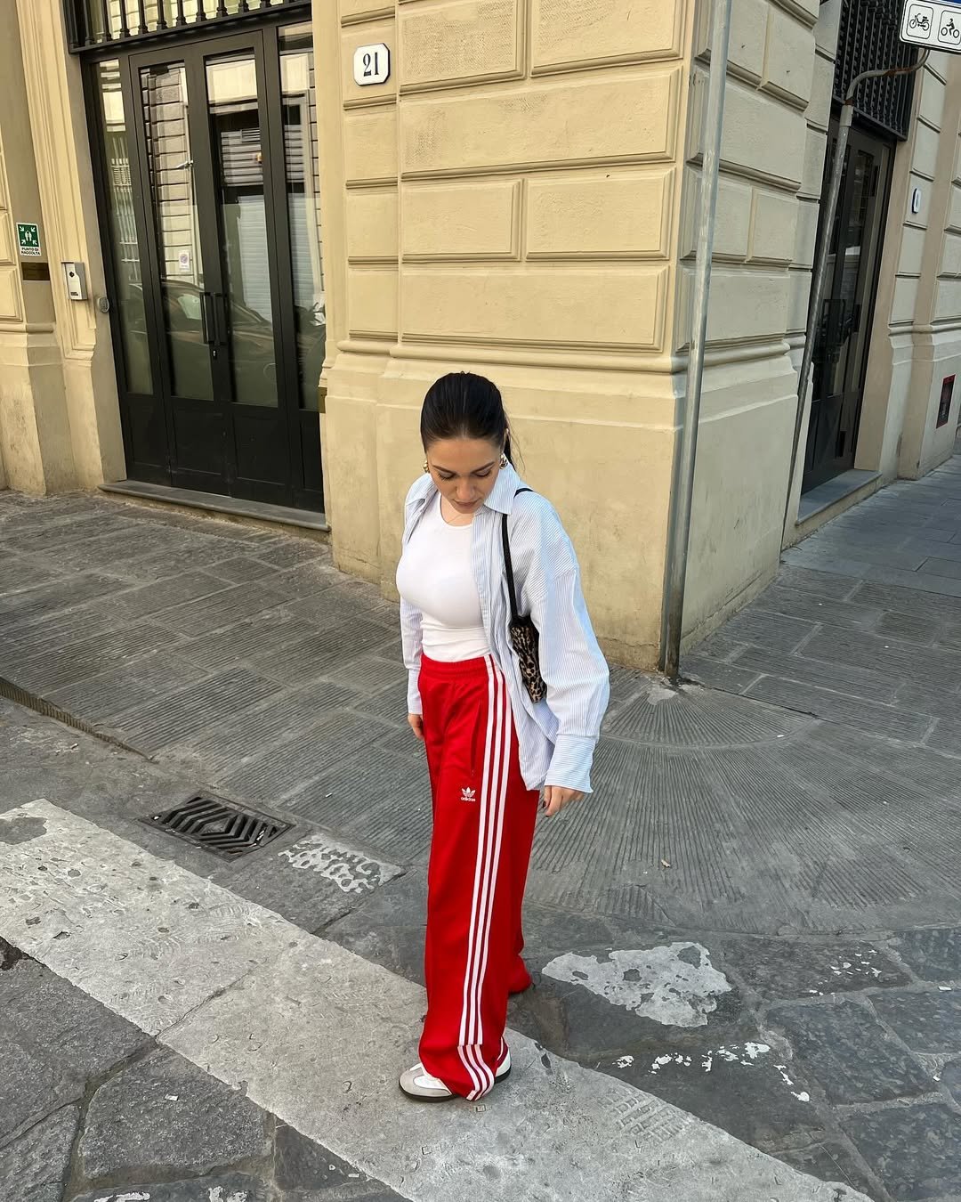 Red track-style sweatpants instantly bring that sporty throwback vibe. Paired with a simple white tee and an oversized button-down, the outfit feels relaxed but thoughtfully styled.