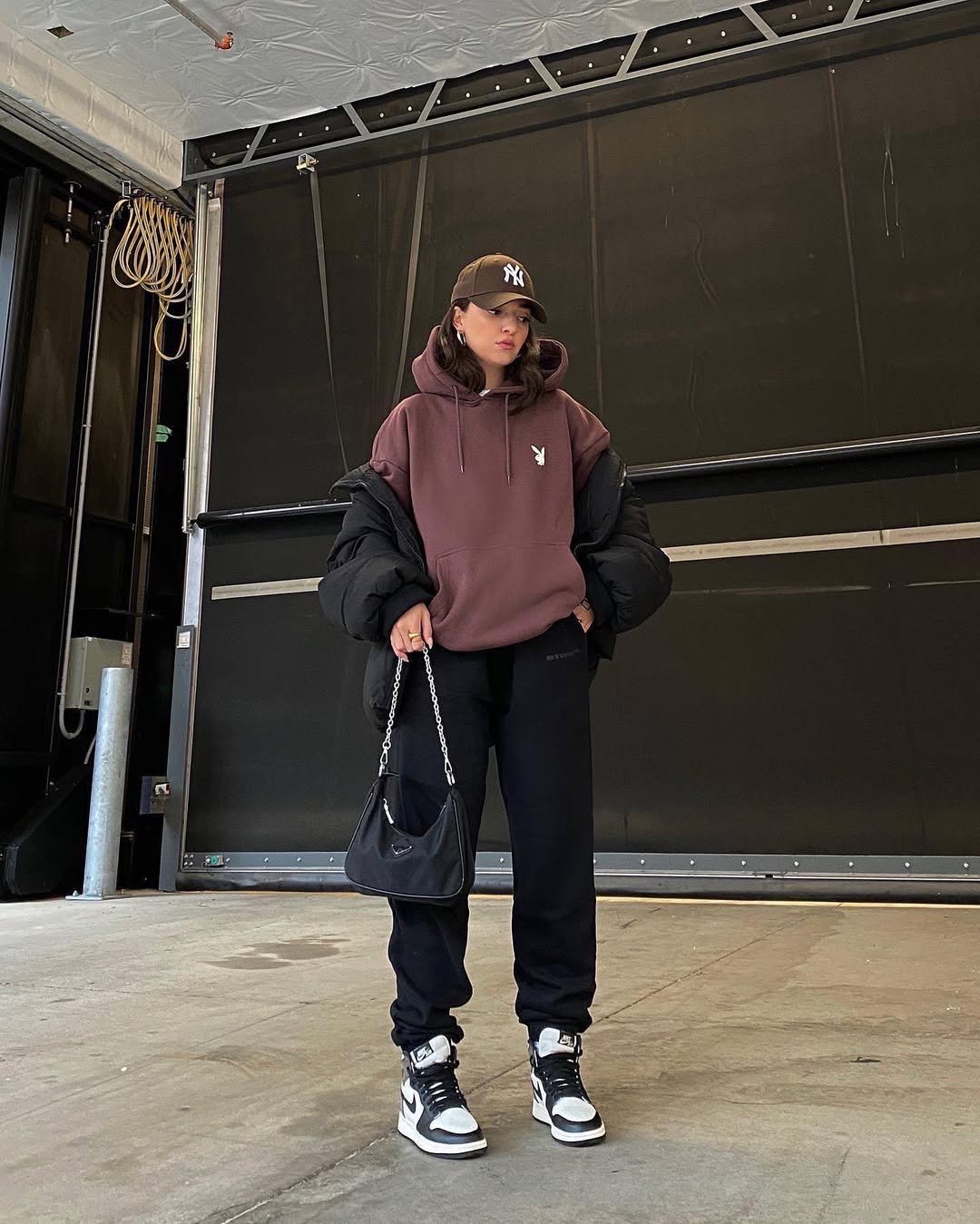This one leans straight into that cool streetwear mood. Black sweatpants paired with a chocolate-toned hoodie already feel effortlessly casual, but the oversized black jacket draped over the shoulders adds a little attitude.