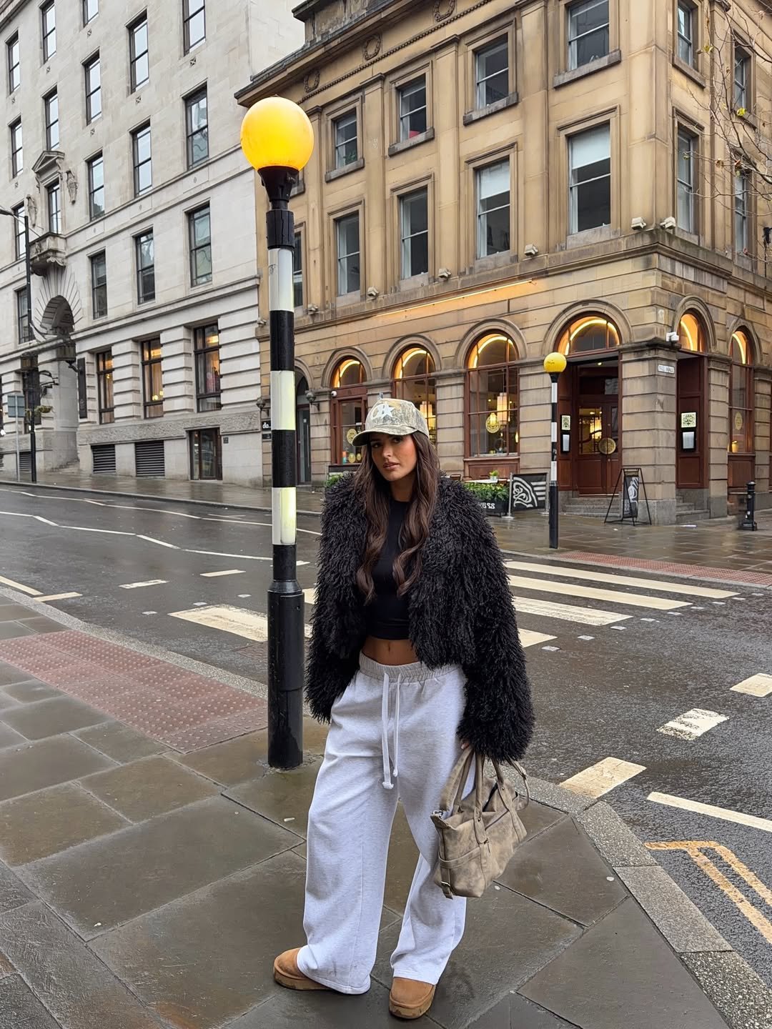This look proves sweatpants can absolutely play in the street style arena. The relaxed grey sweats anchor the outfit, while the shaggy black jacket adds a bold texture that instantly catches the eye.