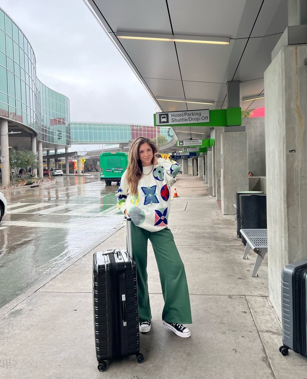 Airport outfits are basically their own fashion category at this point, and this one nails it. The wide-leg green sweatpants keep things comfortable for travel, while the colorful sweater adds a fun burst of pattern.