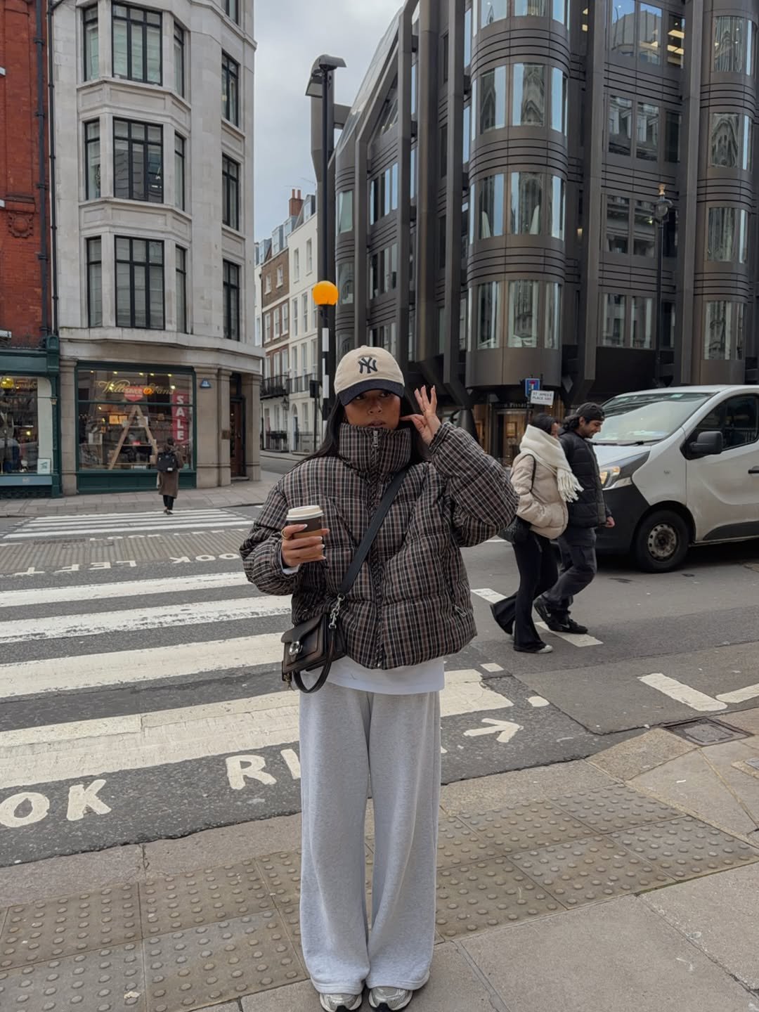 This outfit leans fully into cozy winter layering. Grey sweatpants keep the base relaxed, while the oversized plaid puffer adds warmth and a little street-style flair.