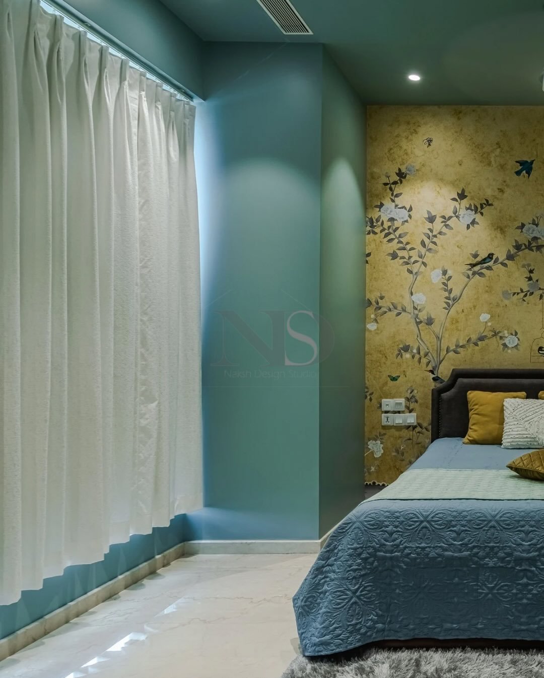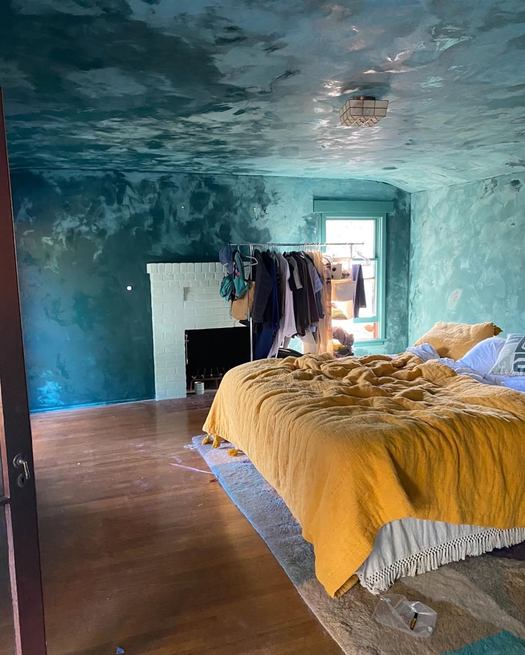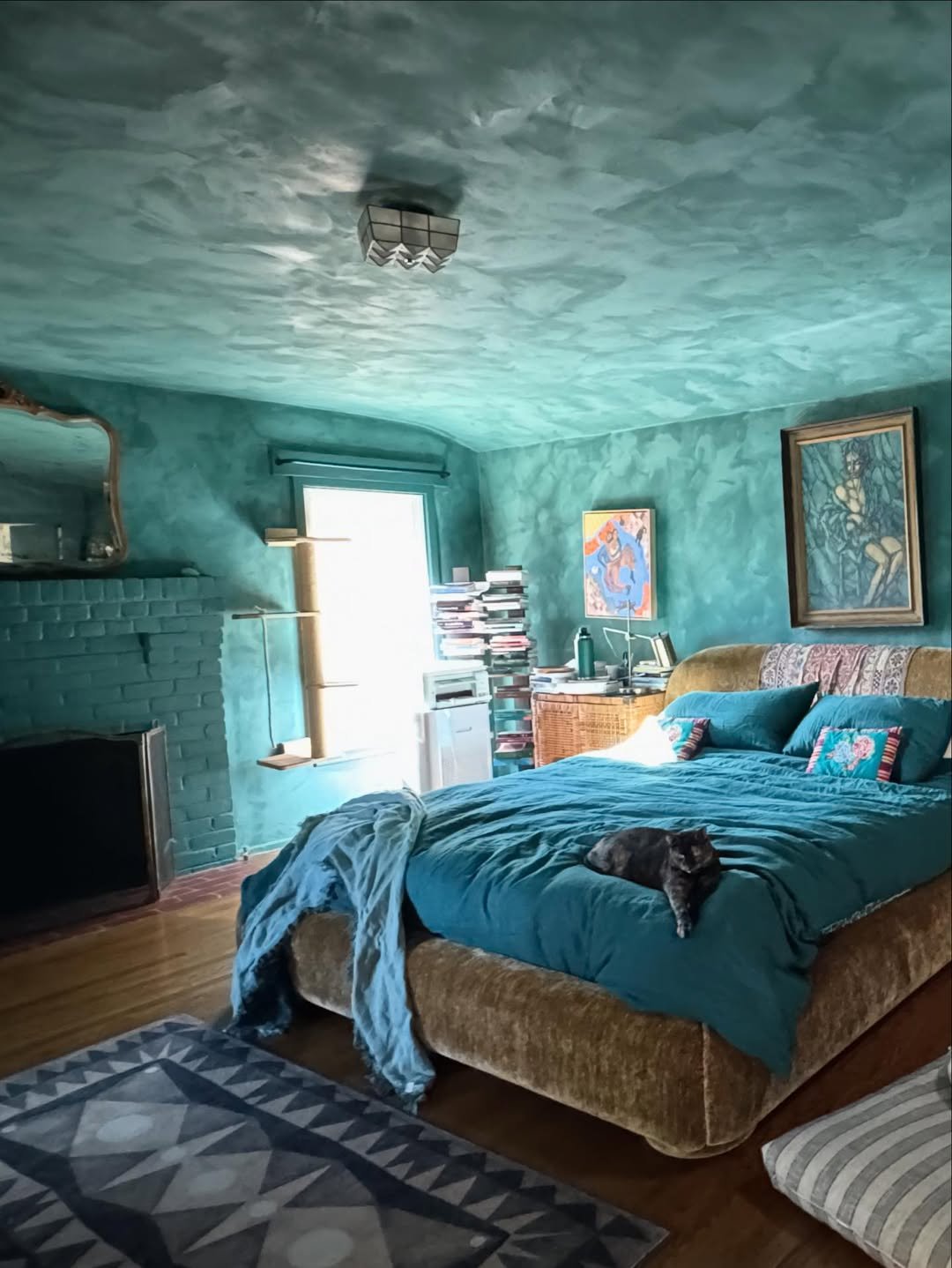 This room feels like a painting you can walk into. The layered teal walls, almost cloud-like in texture, bring movement and depth that shifts with the light.