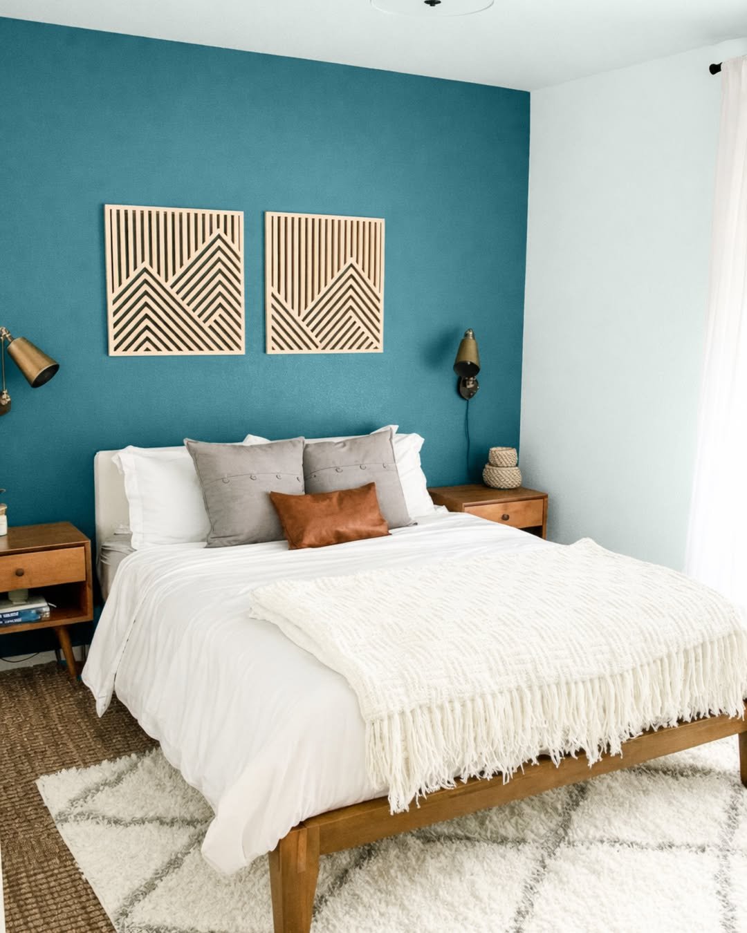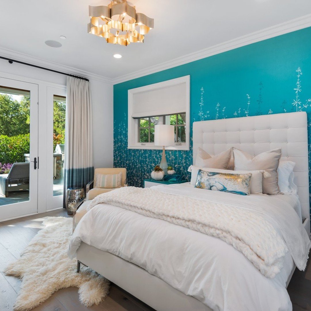 Sometimes teal works best as a statement wall, and this room proves it. Crisp white bedding and soft textures let that vibrant backdrop shine without overwhelming the space.