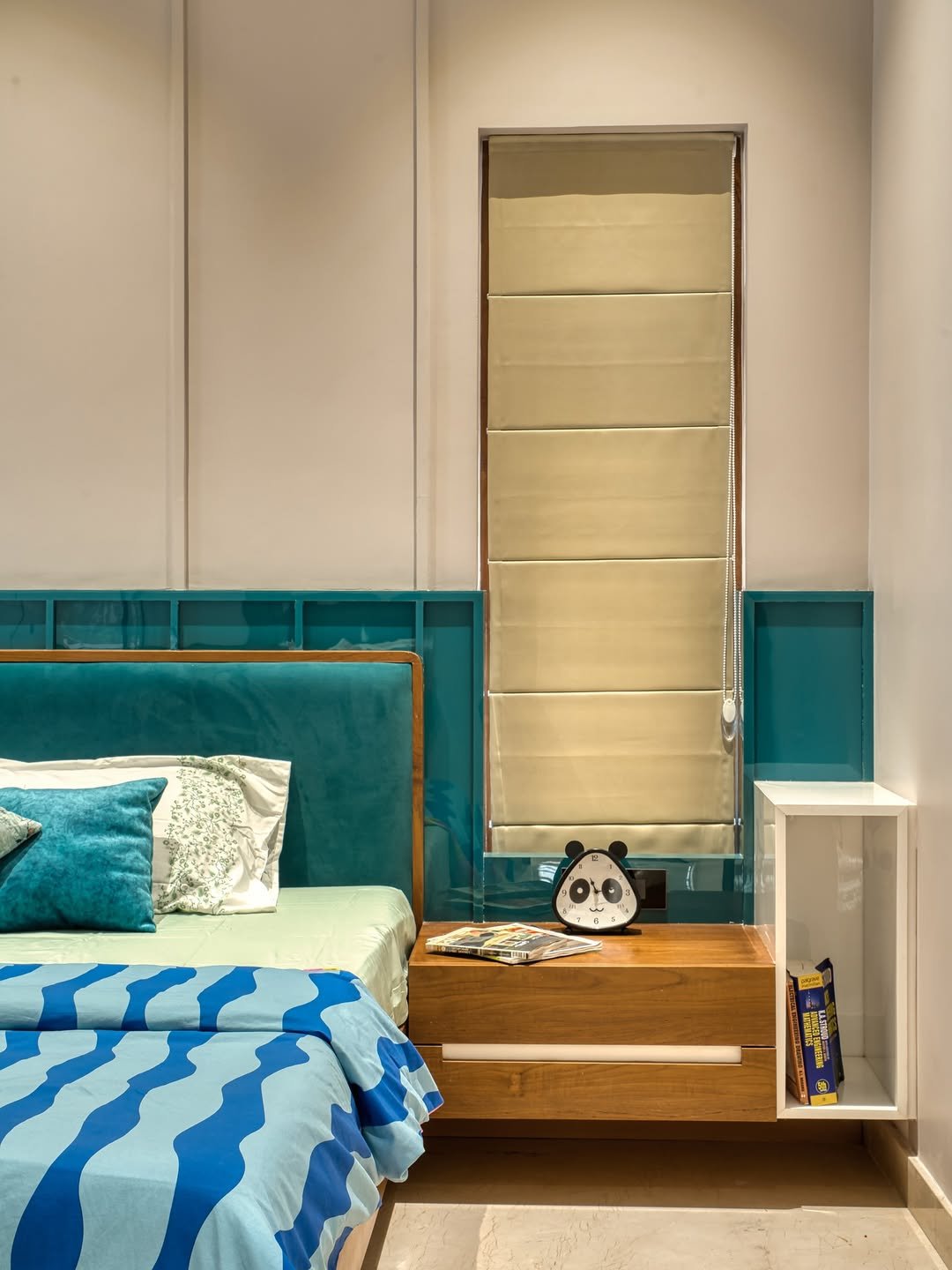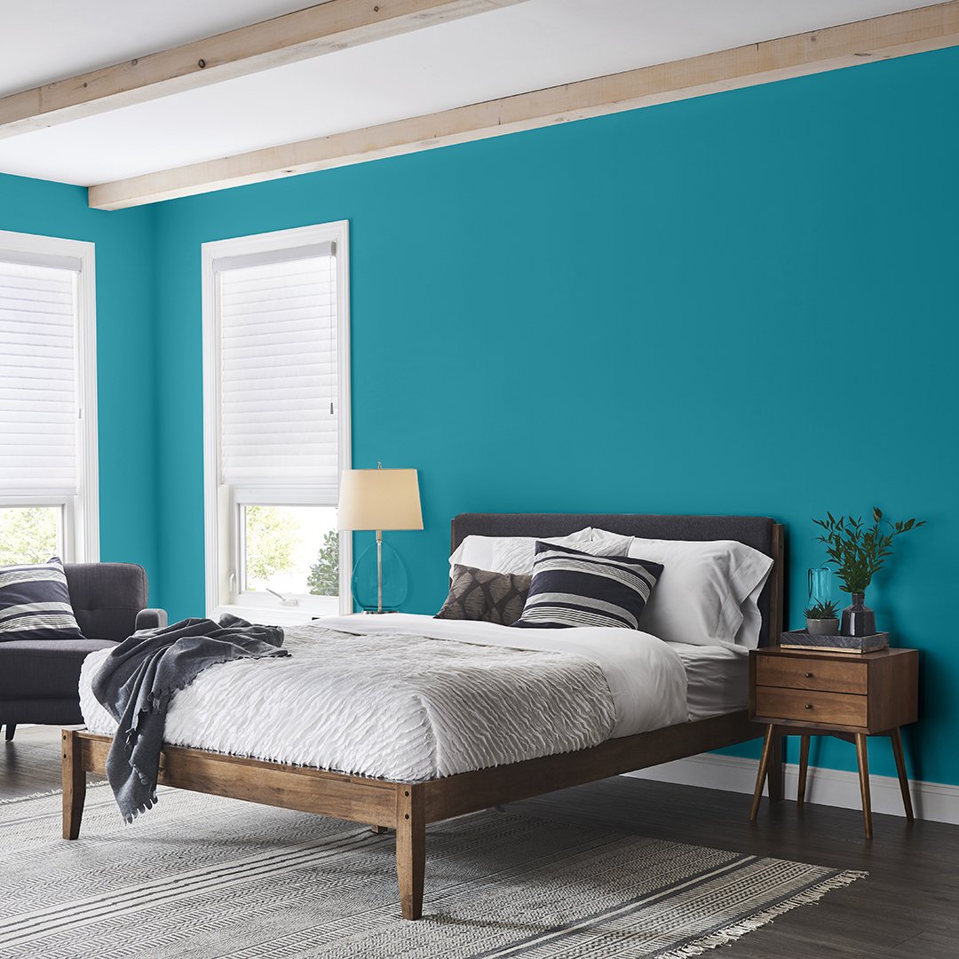 This is teal at its most approachable. Bright, clear, and paired with simple furniture, it turns an everyday bedroom into something a little more alive.