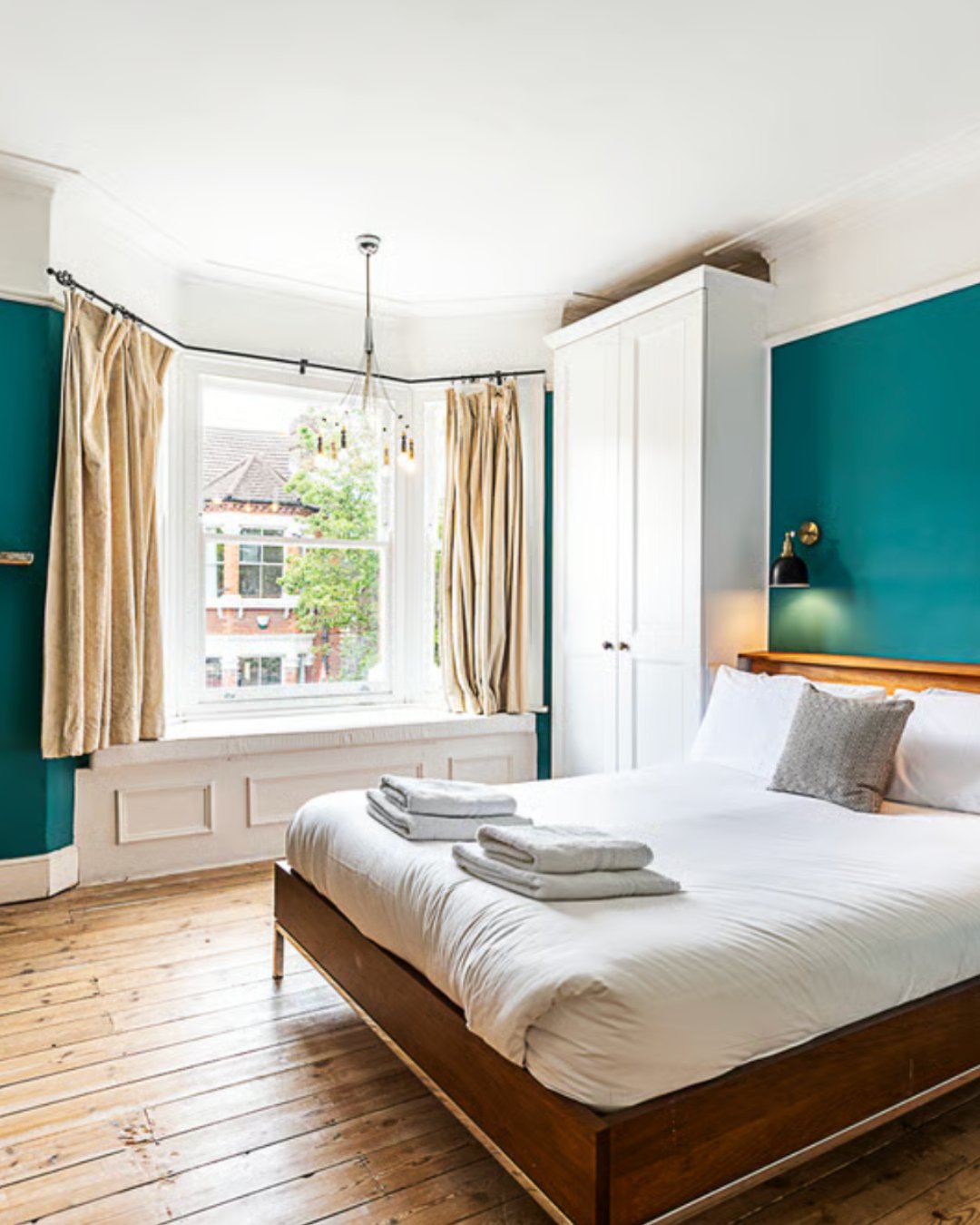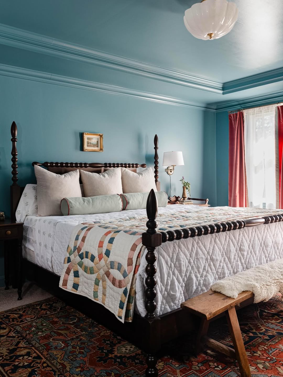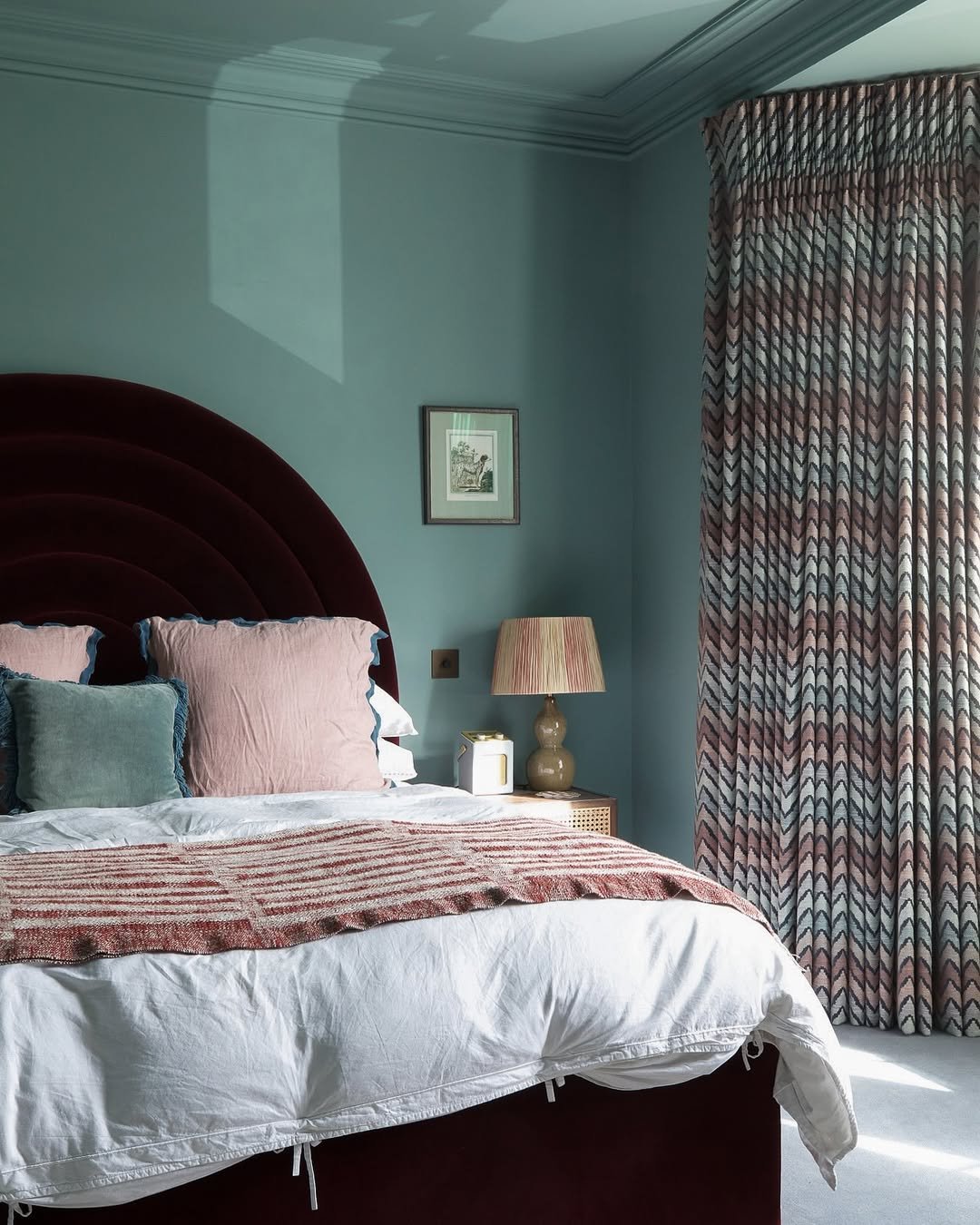 Here, teal leans traditional. Paired with a dark wood four-poster and patterned textiles, it creates a room that feels rooted and familiar.