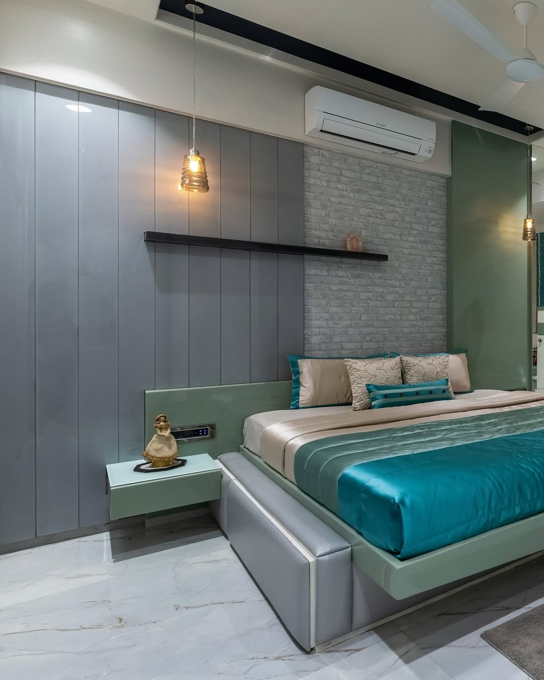 Sleek surfaces and layered materials give this teal bedroom a more contemporary feel. The mix of paneling, brick texture, and glossy finishes creates depth without clutter.