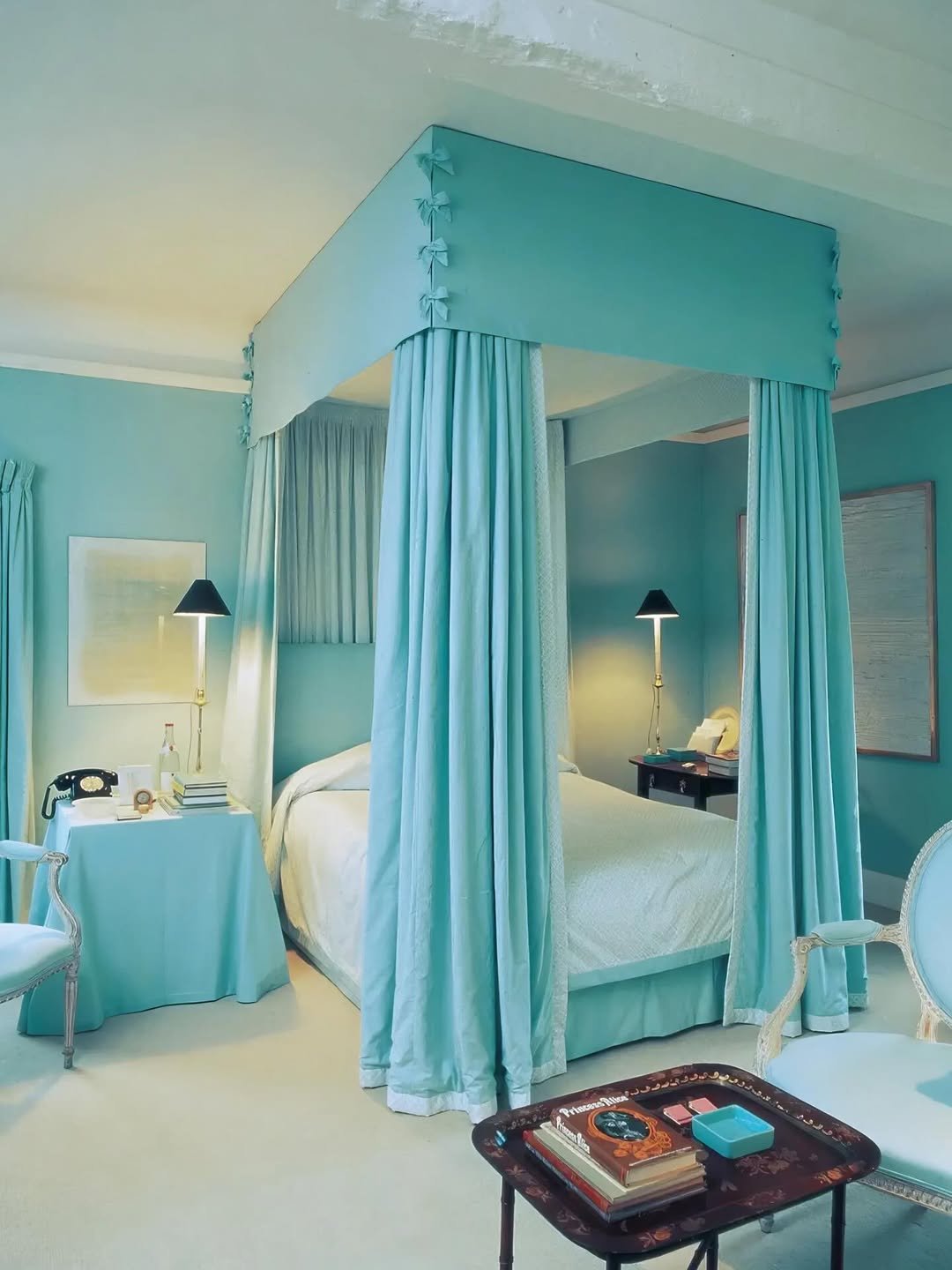 Walking into this room feels like stepping into a single color story. Walls, drapery, and even the canopy blend into one seamless teal envelope.