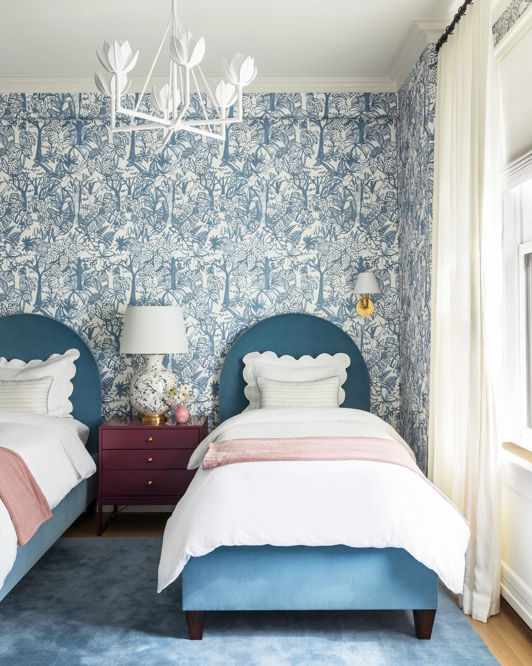 This space leans into pattern without losing control. The wallpaper brings movement, while the upholstered beds ground everything with soft, rounded shapes.
