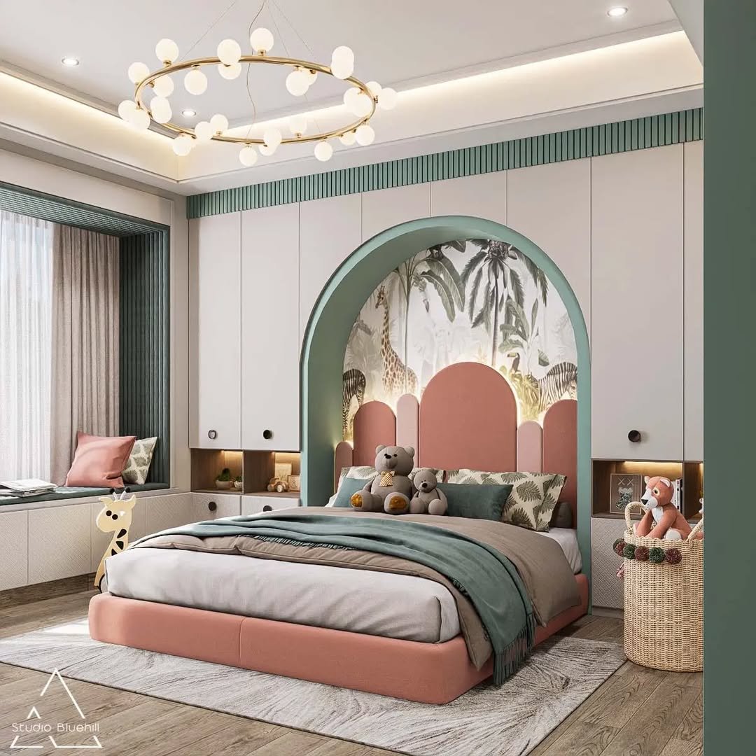 This room feels like a gentle daydream. The teal arch frames the bed like a little storybook nook, layered with blush tones and soft neutrals that keep everything light and welcoming.