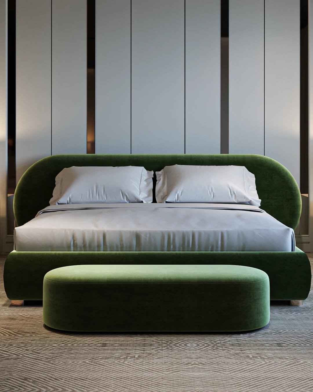 There’s something irresistibly tactile about this space. The deep teal velvet bed curves in all the right places, softening the clean vertical lines behind it. It feels modern, but not cold, more like a quiet luxury you settle into at the end of the day.