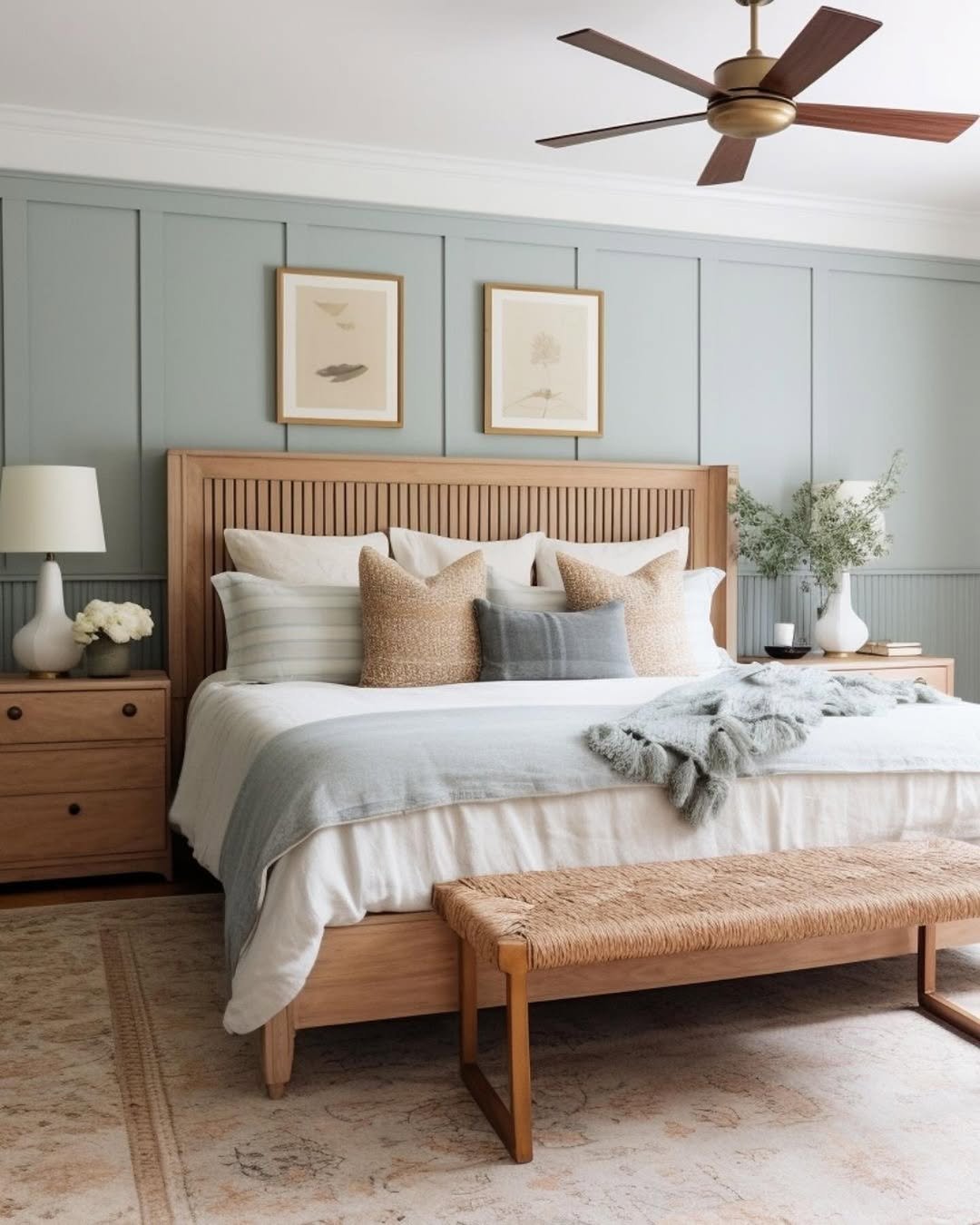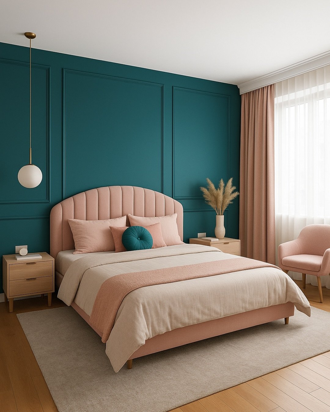 There’s something about teal and blush together that feels instantly elevated. The paneled wall adds structure, while the curved headboard softens the look.