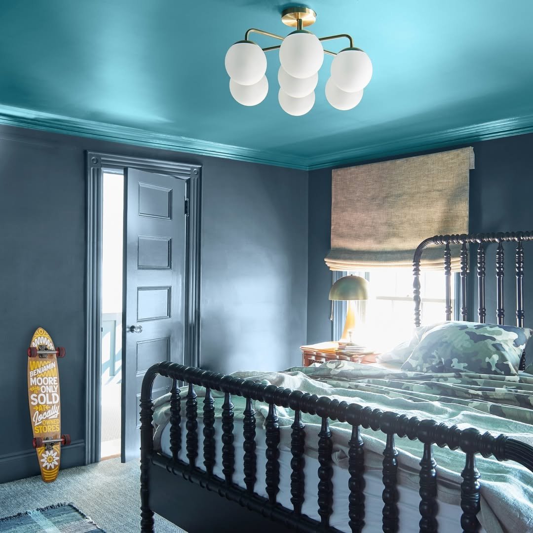 Sometimes it’s not the walls that steal the show. Here, the teal ceiling draws your eye upward, wrapping the room in color without overwhelming it. Paired with deep gray walls and that classic spindle bed, the whole space feels grounded yet quietly bold.