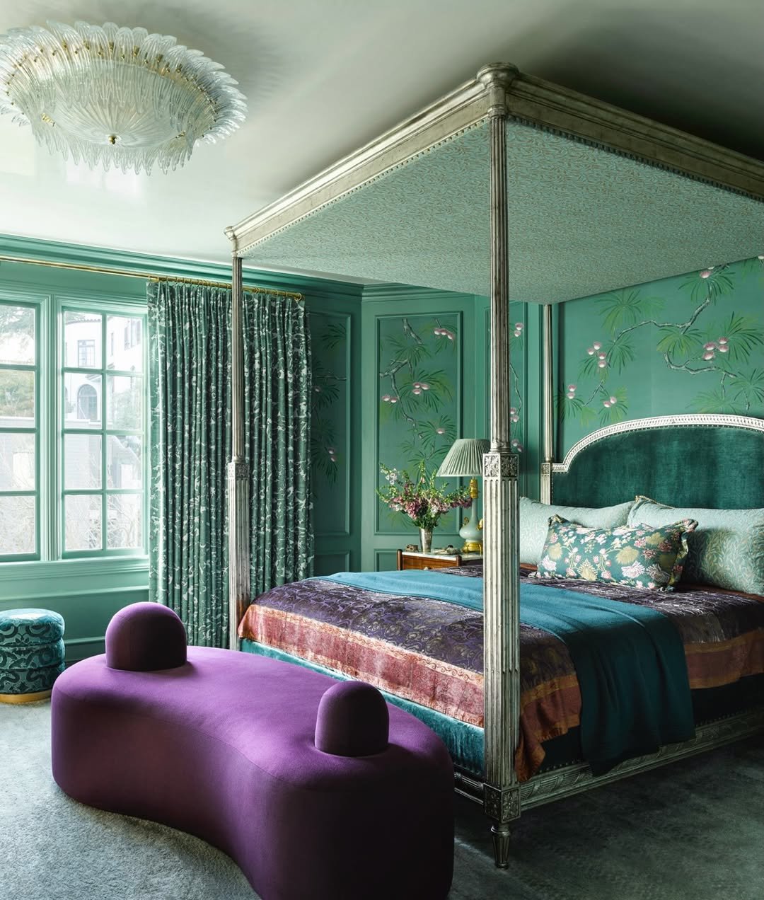 This is teal turned all the way up. Walls, drapery, and bedding blend into a rich, immersive palette, while that plum bench adds just the right hit of contrast.
