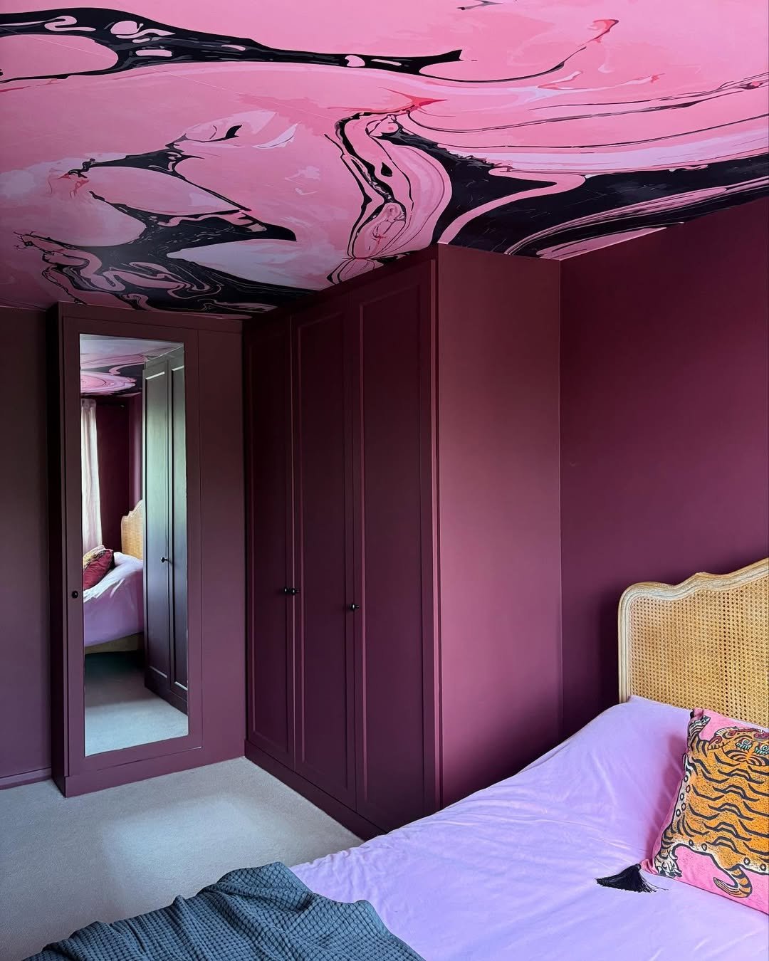 This one leans into contrast in the most unexpected way. Teal steps aside for a moment, letting deep plum walls and a marbled pink ceiling take over.