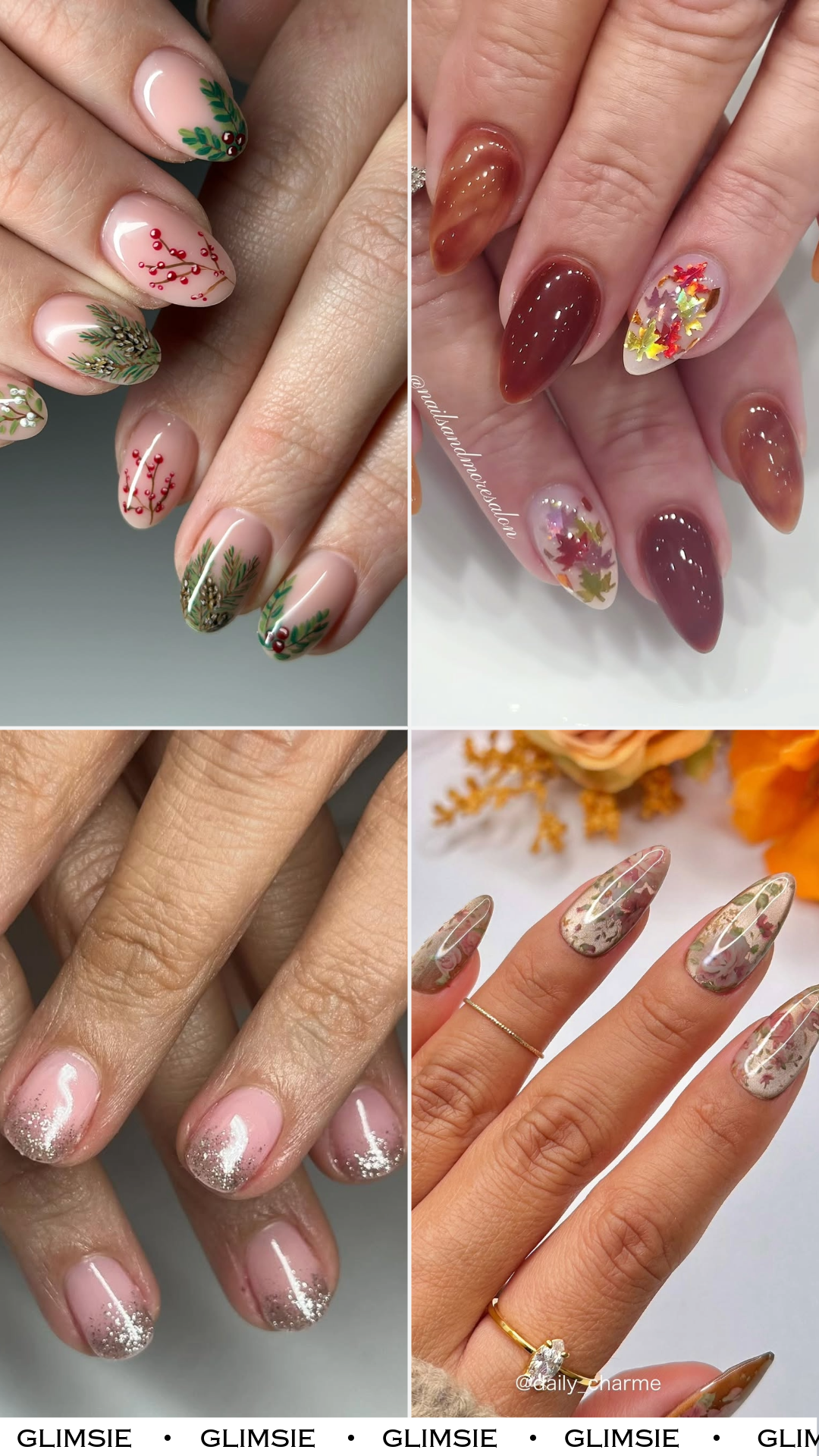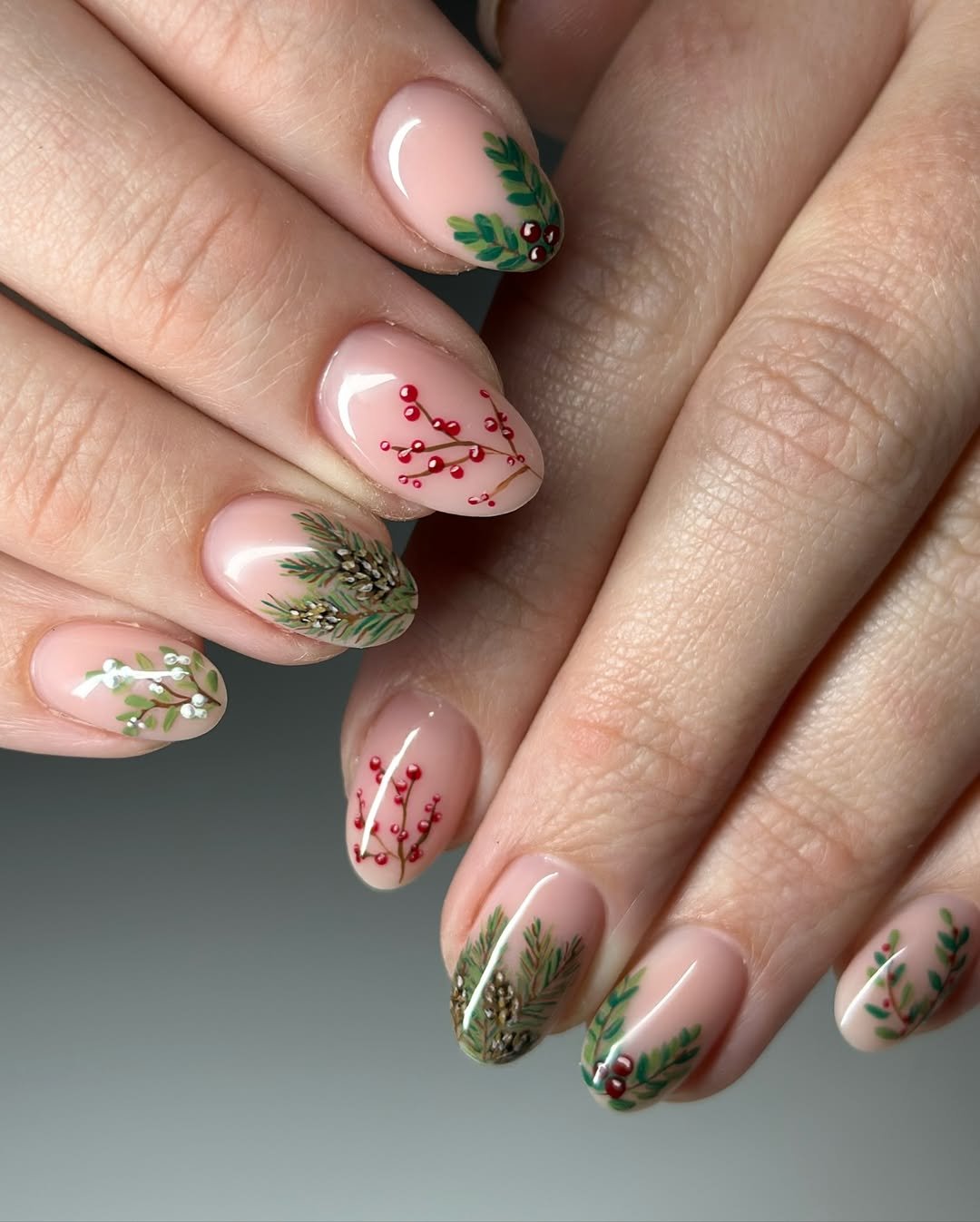 For those who lean minimal but still want seasonal, this design whispers autumn elegance. The delicate holly, berries, pine needles, and muted greens feel like tiny watercolor paintings — only on your fingertips. Paired with a nude base, they’re timeless, polished, and perfectly festive without screaming it.