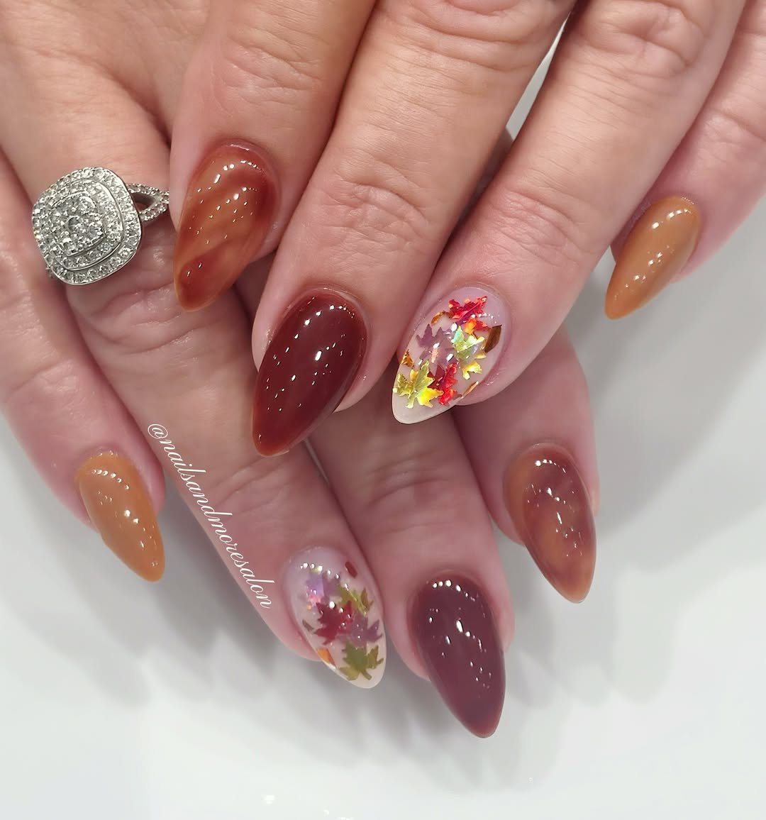 Gradient goals, anyone? @nailsandmoresalon took warm brown tones and gave them a smooth, milky finish that feels like melted caramel. The leaf-shaped confetti in accent nails keeps it playful and right on theme for the season.