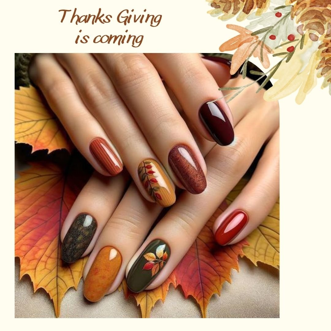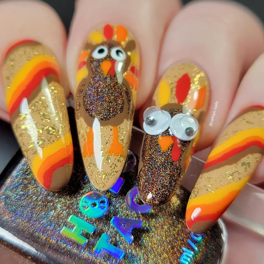 Whimsical without being kitschy, these nails are bold but wearable—thanks to the neutral base and symmetry of the feather pattern. And the little turkey face? Iconic. These are the nails that spark conversations at the dinner table.