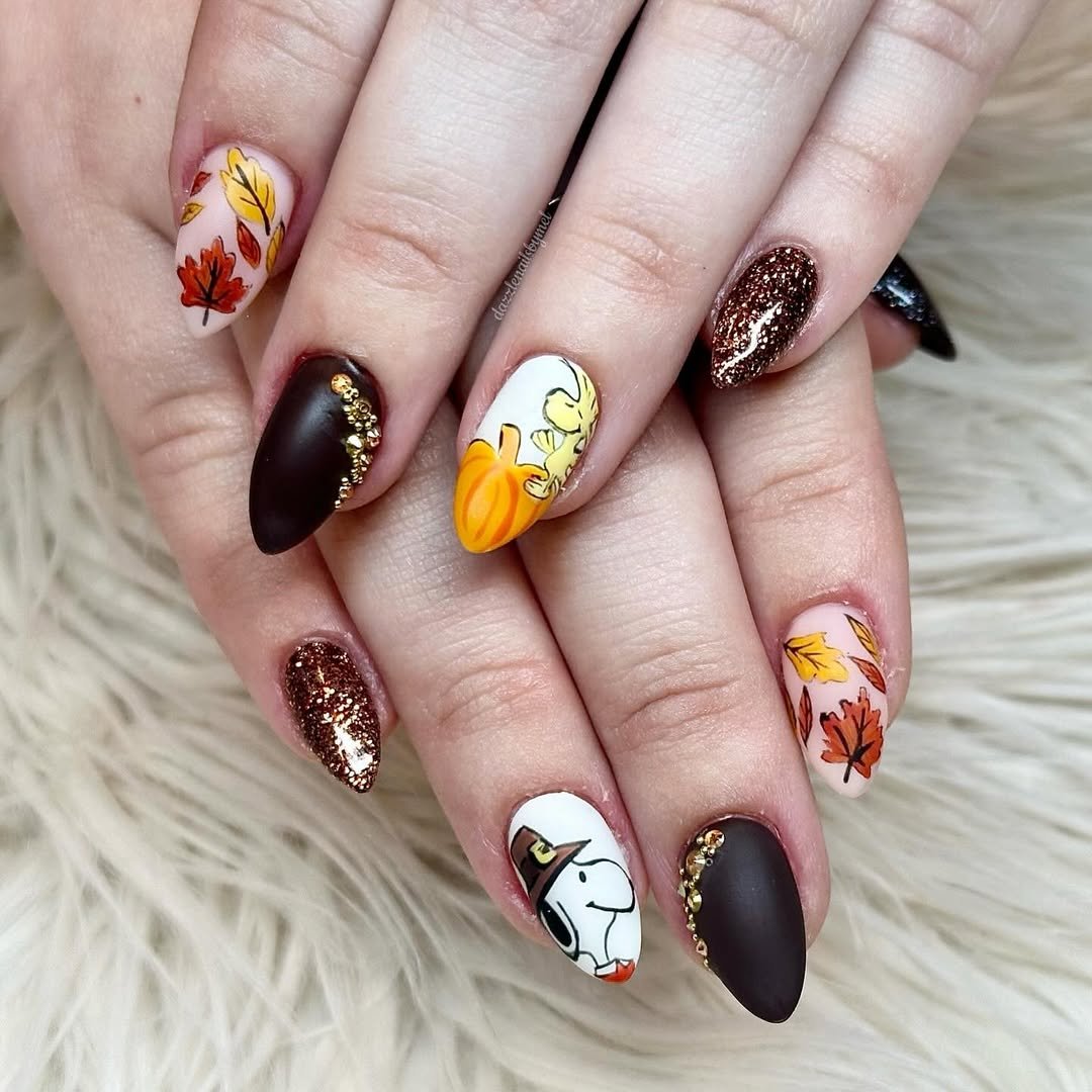 Who said Thanksgiving nails couldn’t be adorable? @dazzlenailsbymel turned the season of stuffing into a nail masterpiece with hand-painted Snoopy, leafy accents, and sparkly bronze tones that scream “hot cocoa weather.” The rich chocolate matte brings contrast and elegance, while the little pops of gold rhinestones give just enough glam to elevate the look.