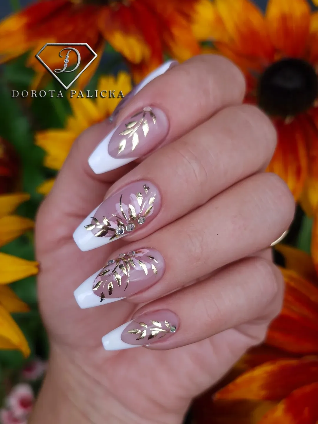 Oh hello, luxe leaves. @dorotapalicka delivers a crisp take on autumn elegance with these golden foil florals over a clean French tip base. It’s got that soft bridal feel, but just edgy enough with those chrome details and precise placement.
