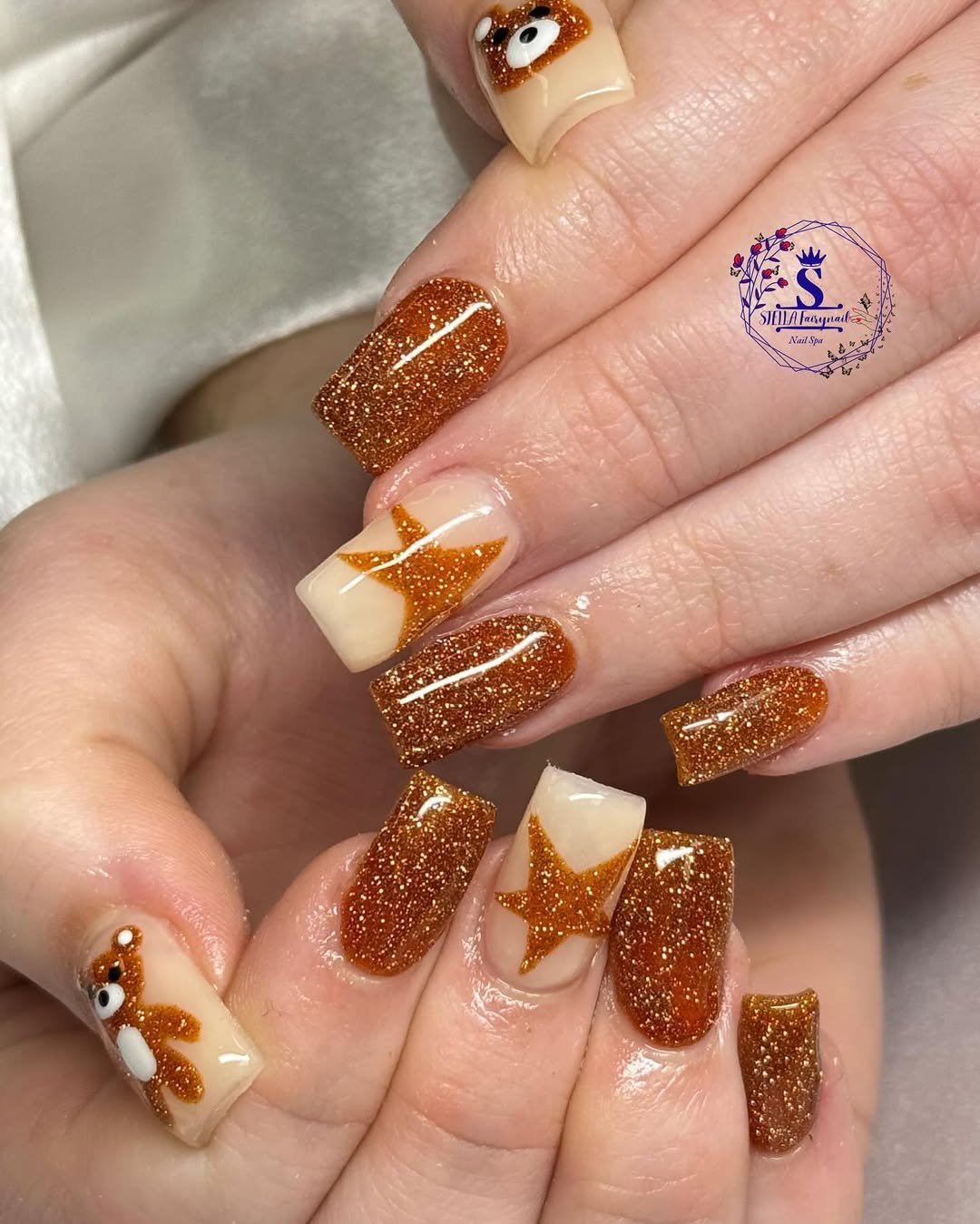 Somehow, @stella.fairynail managed to mash up teddy bears, glitter, and fall tones into one set—and it works. The copper glitter is rich and dazzling without feeling over-the-top, and the teddy bear art adds that little “aww” factor that’s totally unexpected.