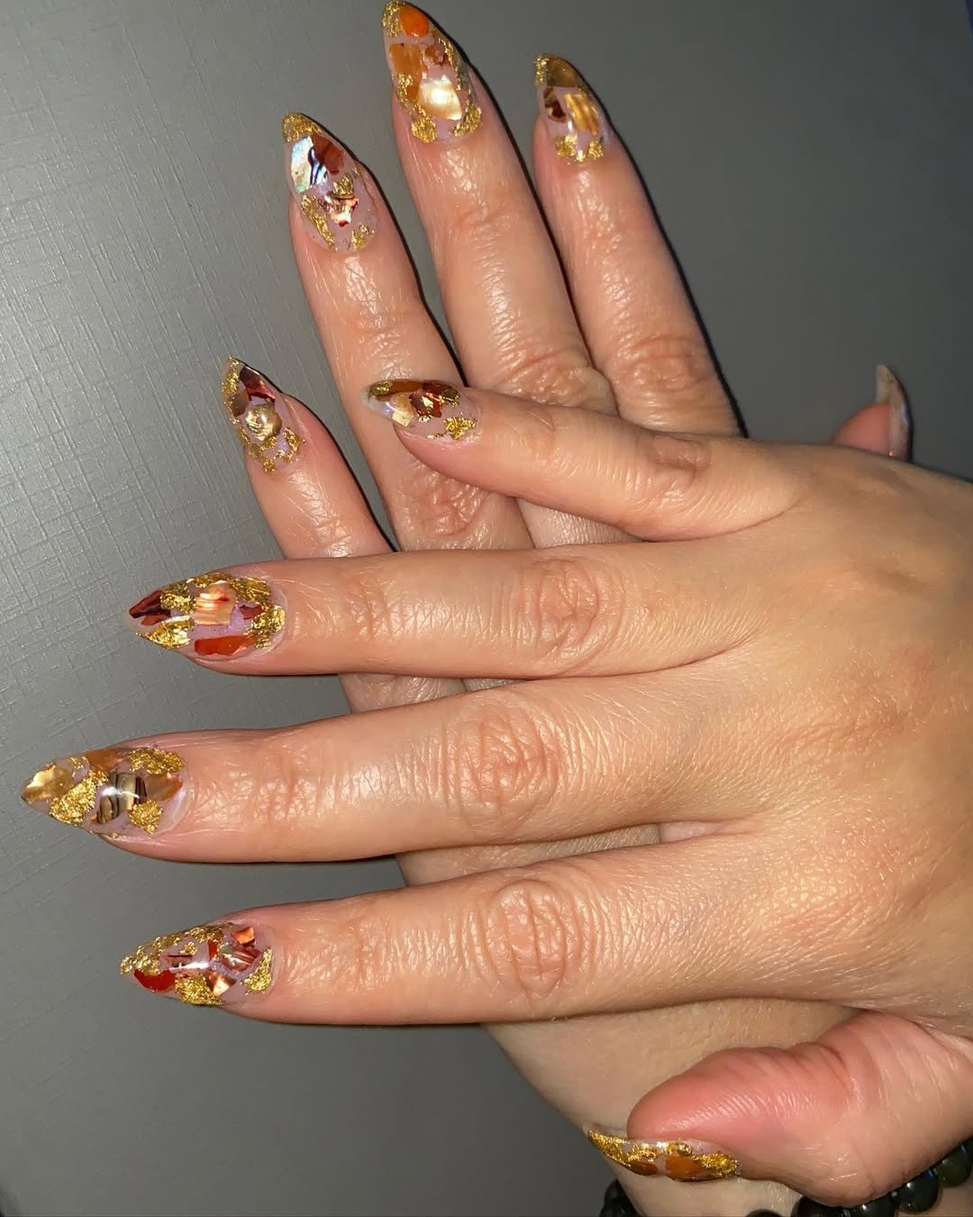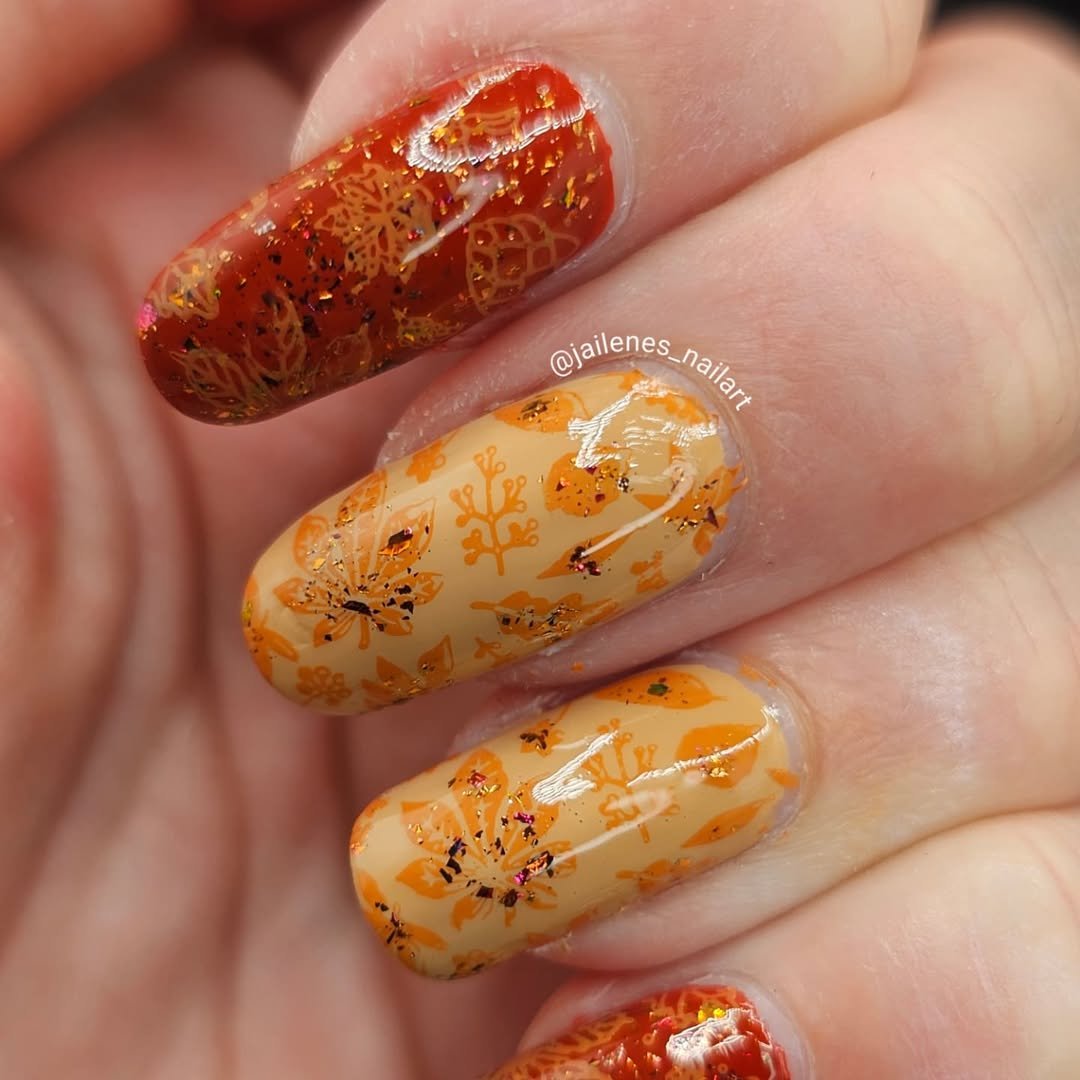 Bold, gold, and ready to dazzle—@jvsblog10 brought the bling to fall with this mosaic-style set. Golden foil chunks are layered over translucent bases with burnt oranges and reds peeking through, giving it a “leaf pile meets luxury” vibe.