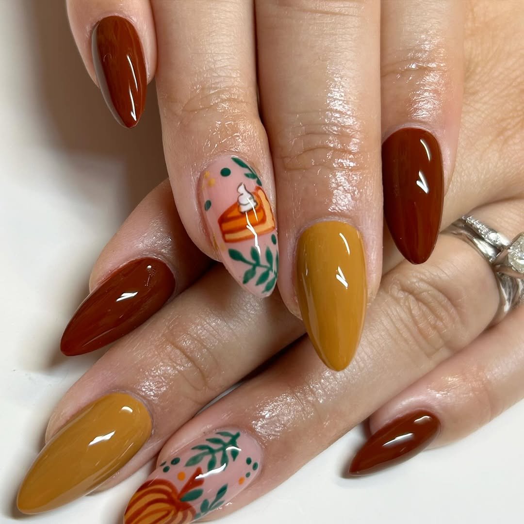 @nyonbywhitney brought us a fall-forward palette that’s totally wearable—and still has room for pumpkin pie. The burnt oranges, mustard yellows, and cocoa browns create a cozy color story, but it’s those accent nails that steal the show. One hand shows off slice-of-pie art topped with whipped cream, the other, a pumpkin and foliage design that’s almost too cute to be real.