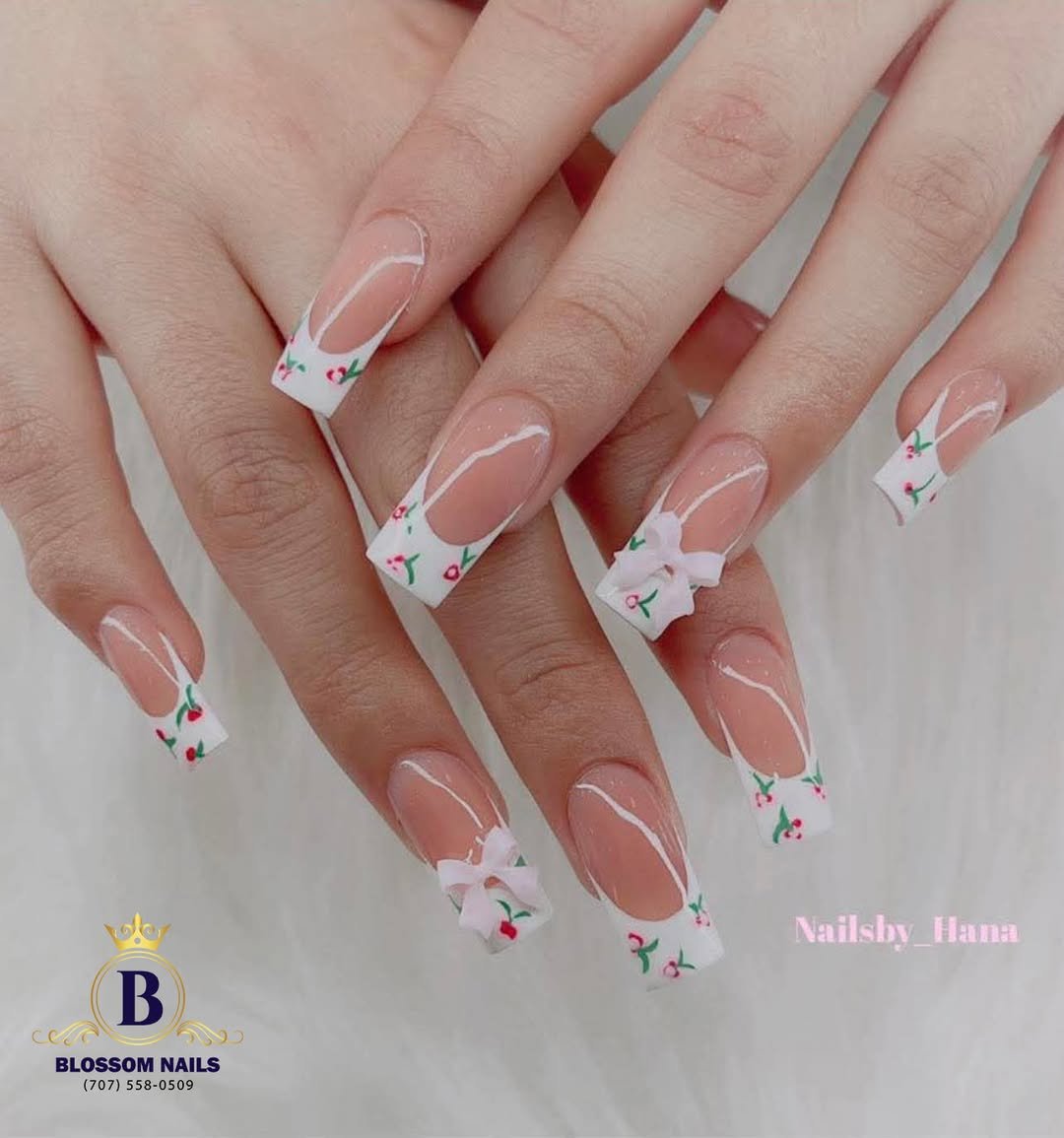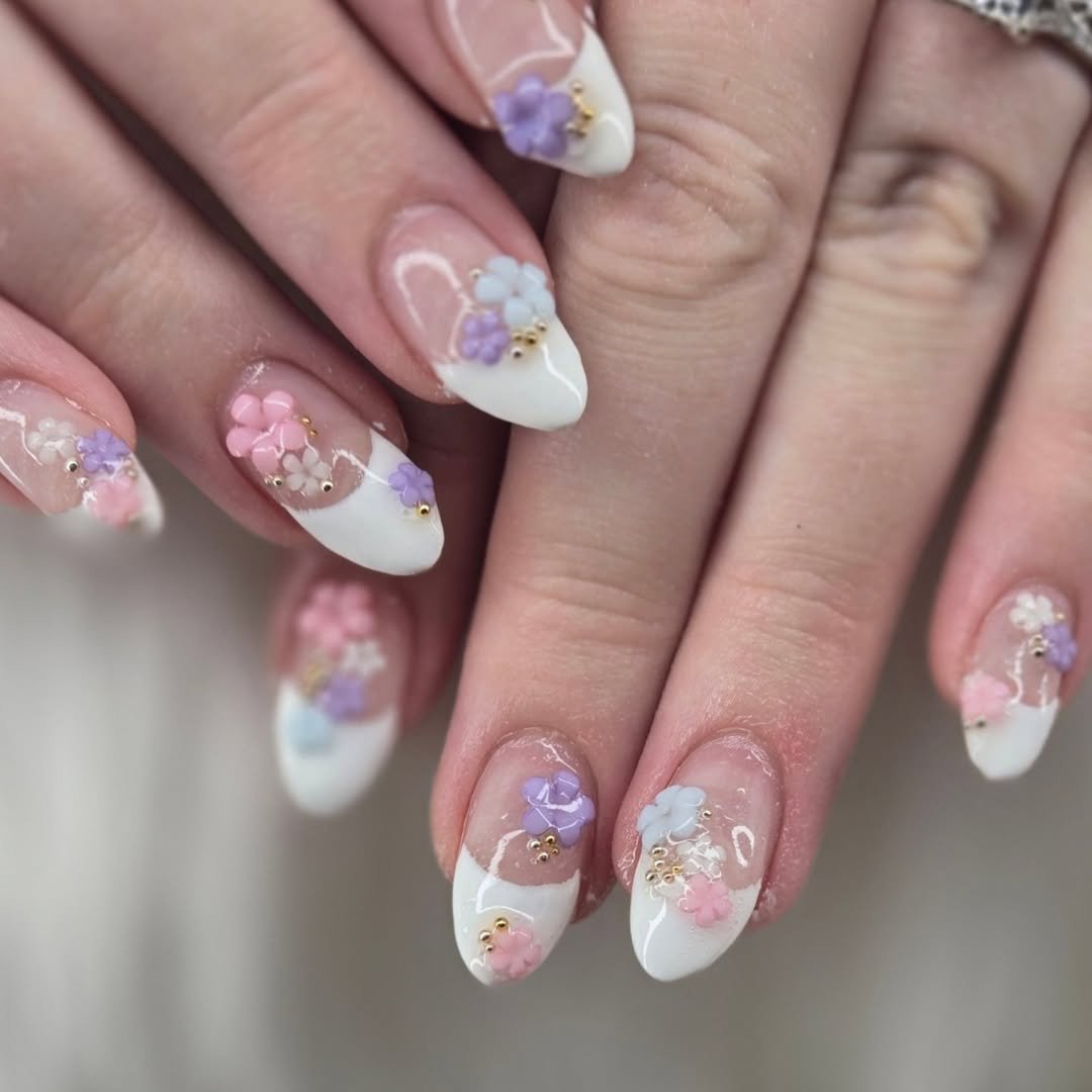 These nails have that soft romance energy—perfect for engagement season, baby showers, or just reminding yourself that pretty things exist. The tiny gold beads in the center of each flower give them a luxe finish without being too extra.