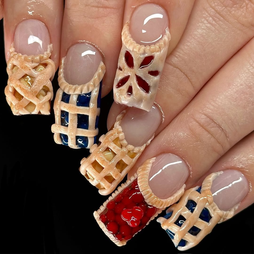 Yes, these are nails. And yes, they’re little 3D pies. @nailzz_by_kat said, “Why not sculpt lattice crusts and fill them with faux fruit fillings?” and honestly, we’re not mad about it. Each nail looks like a miniature dessert from a retro diner display case.