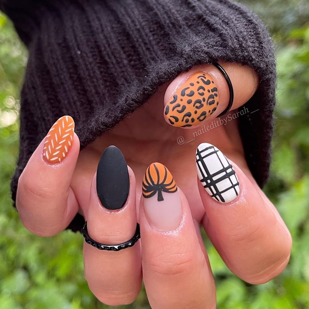 Bold, graphic, and unapologetically fun — this set is basically the Thanksgiving version of a mood board. Leopard print, matte black, plaid, and even a pumpkin tree? This is for the nail lover who treats each finger like its own canvas, and every season like a creative prompt.