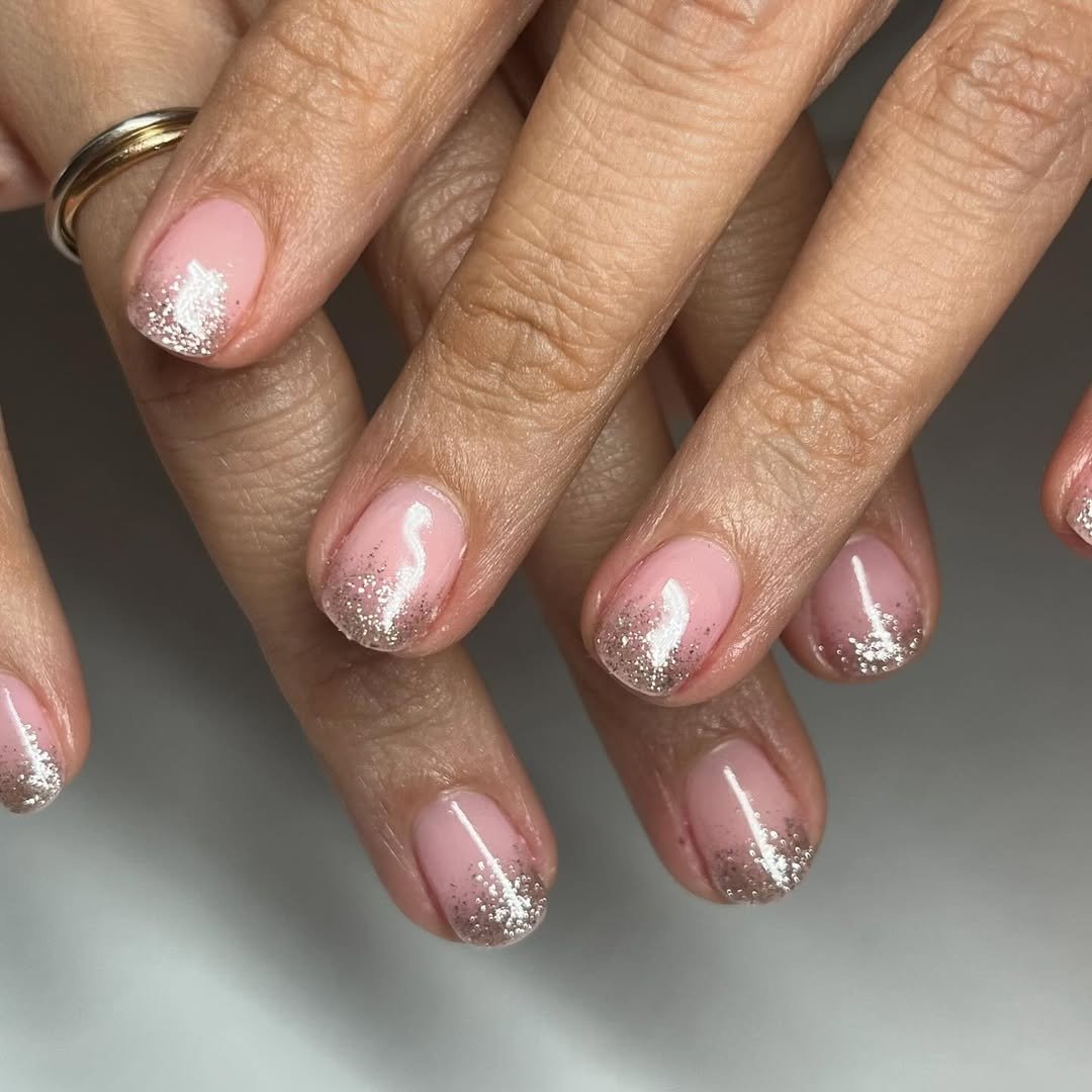 @vanityprojectsmia knows how to do understated sparkle right. These soft pink nails are kissed with silver glitter at the tips—a reverse French that feels delicate, festive, and fresh. They’re short, sweet, and seriously sophisticated.