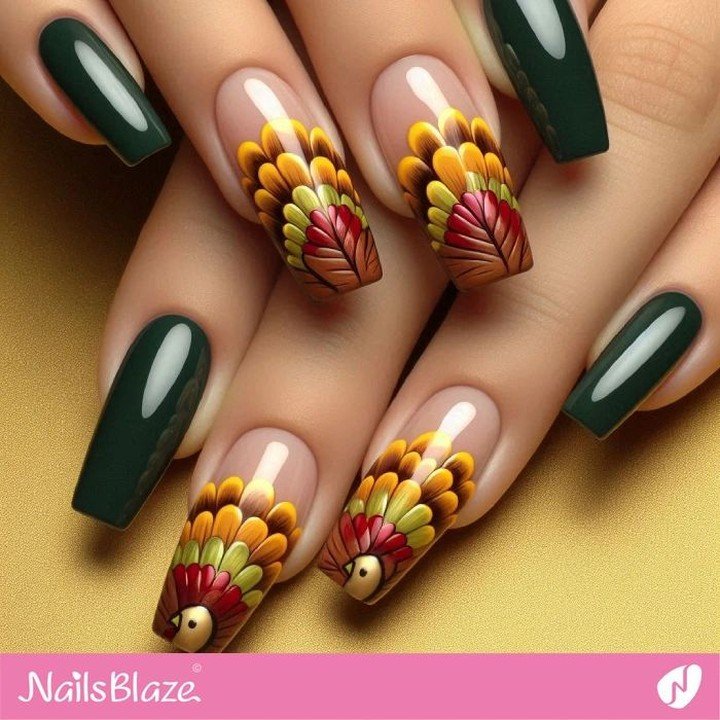 @Nailsblazeofficial understood the fall assignment and turned it into a cartoon dream. This turkey-feather set blends vibrant ombré feathers with a neutral base and forest green solids that let the artwork shine.