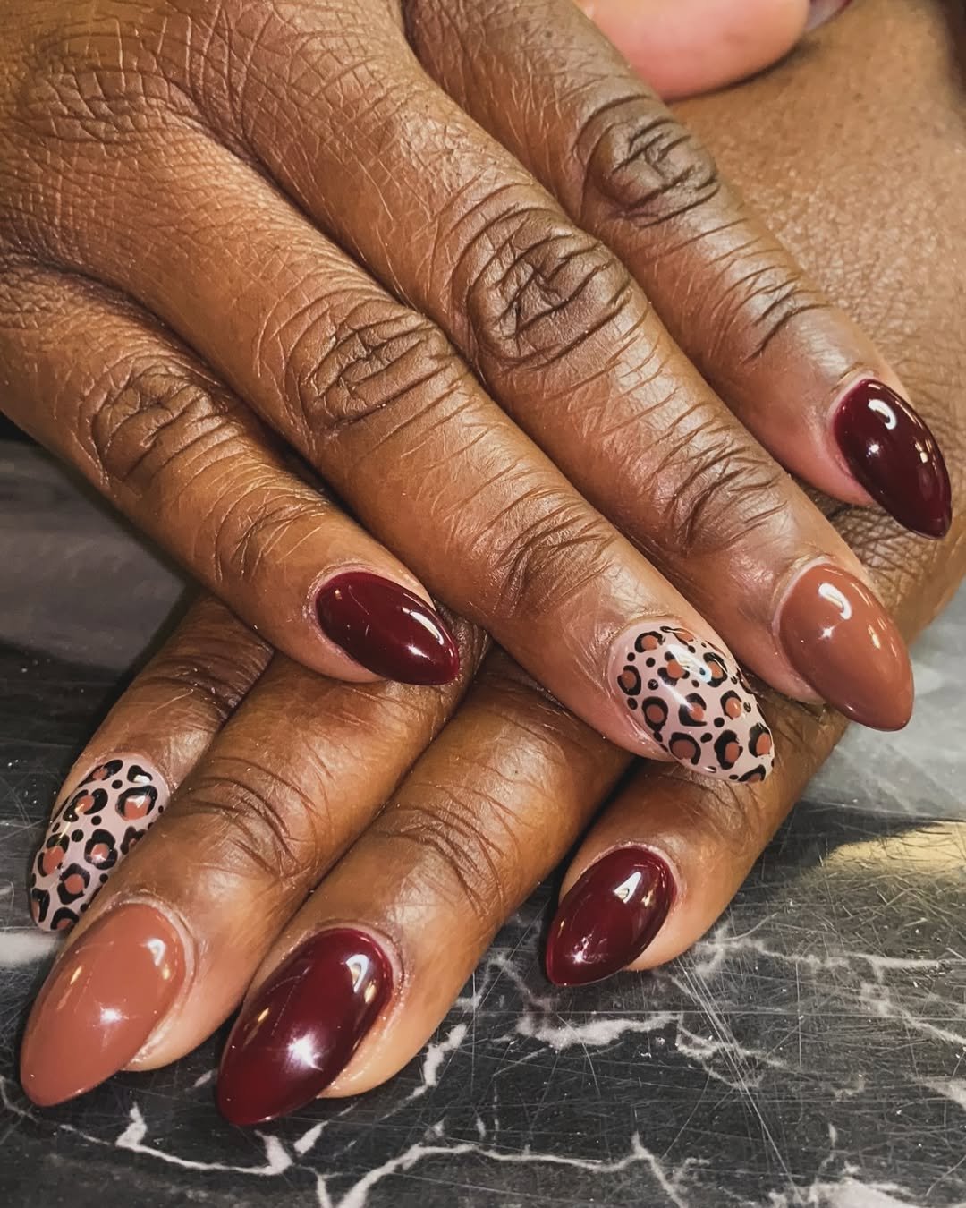 Deep burgundy, glossy neutrals, and a touch of leopard? Yes, yes, and yes again. This set is moody and elegant with just enough flair to keep it festive. It’s giving “grown and gathered,” like the nail version of a rich fall wine with dessert.