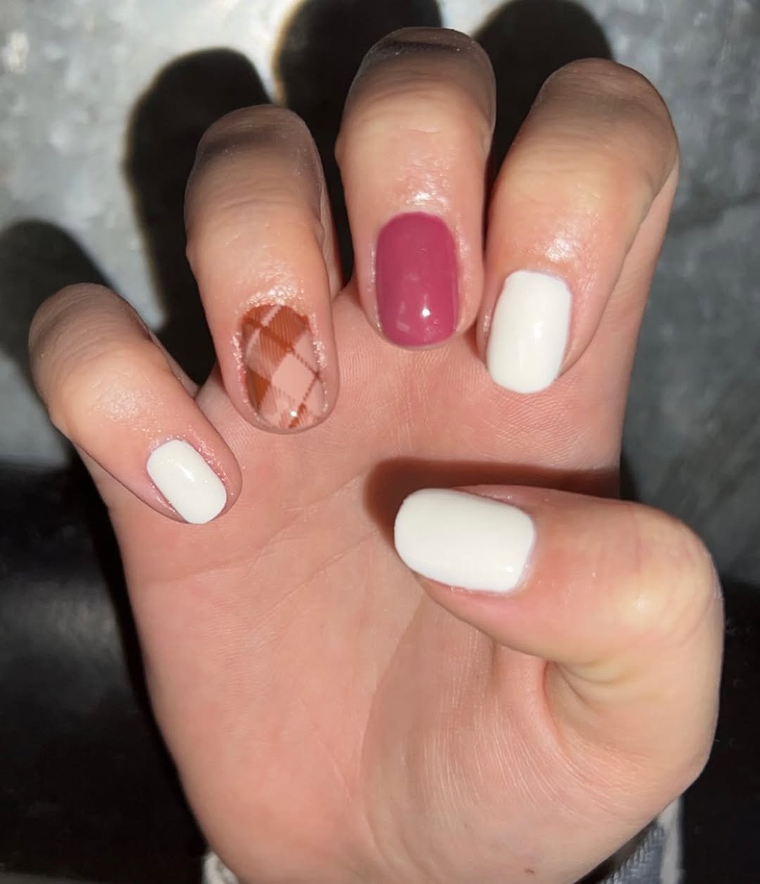 @nailsbymakena keeps it minimal yet polished with a sweet blend of creamy white, dusty rose, and one perfect argyle moment. That single plaid accent makes the whole set feel festive, like a soft Thanksgiving nod without being too literal.