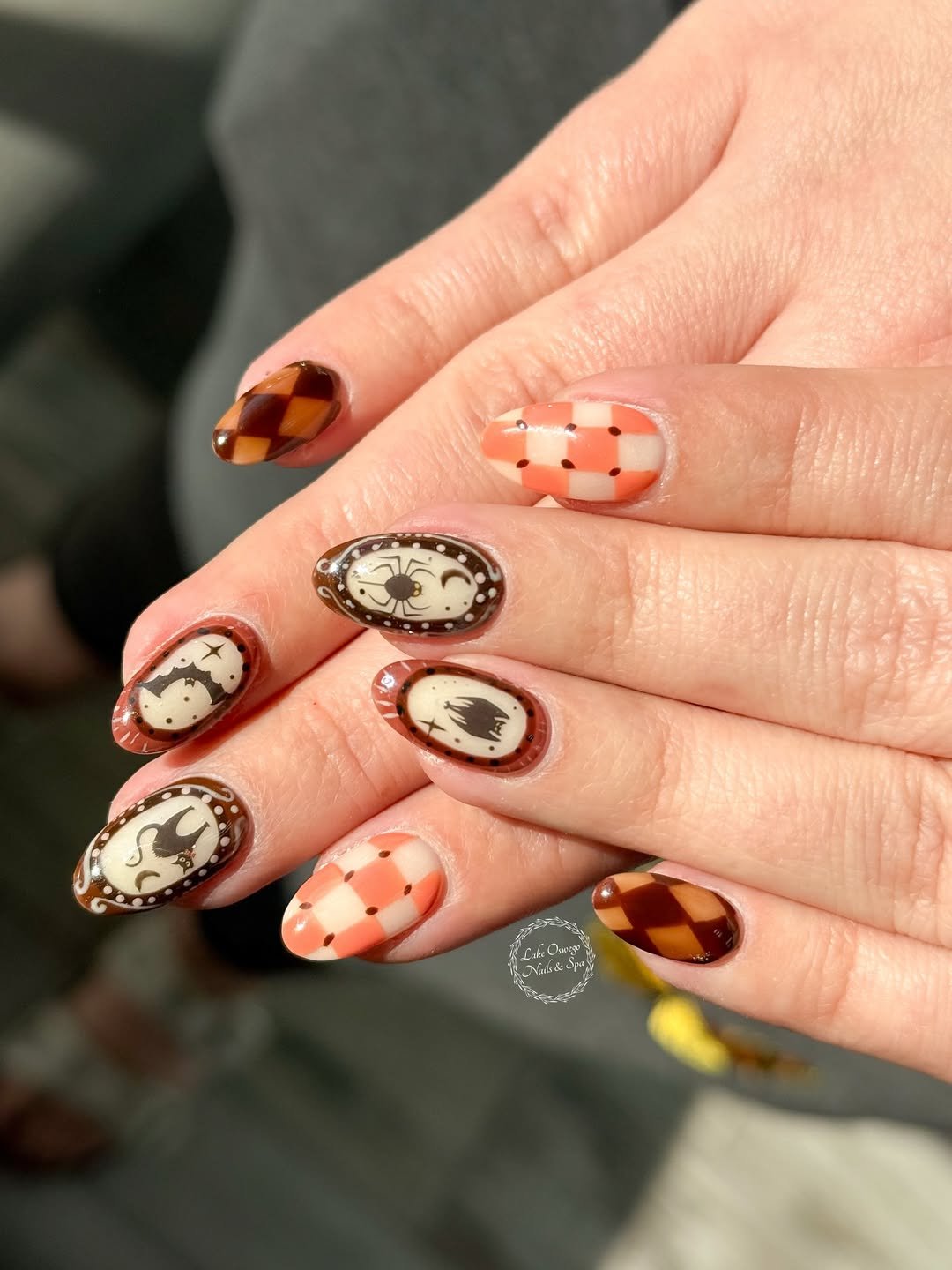 This set is like a nostalgic stroll through a vintage fall postcard. @lakeoswegonails nails (literally) the Thanksgiving vibe with a mix of soft orange plaid, chocolate argyle, and miniature cameos framed in brown—each tiny portrait etched with cozy seasonal details like cats, bats, and spiderwebs. It’s giving “grandma’s attic but glam,” and we’re totally here for it.