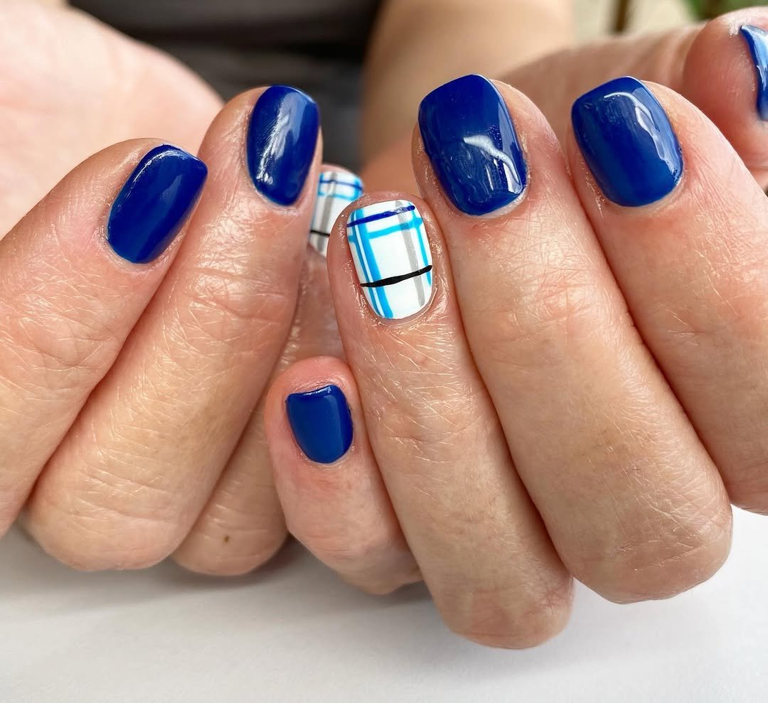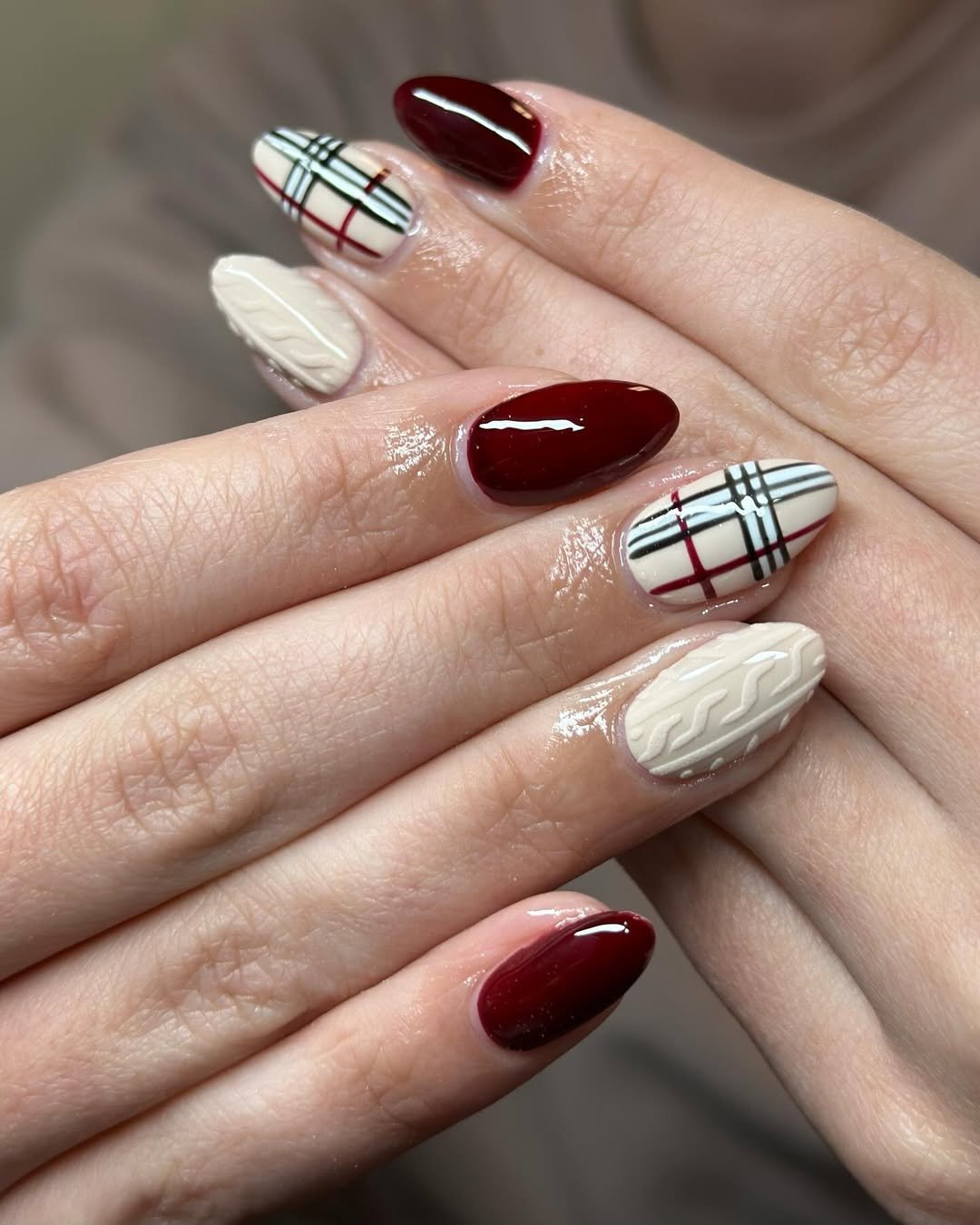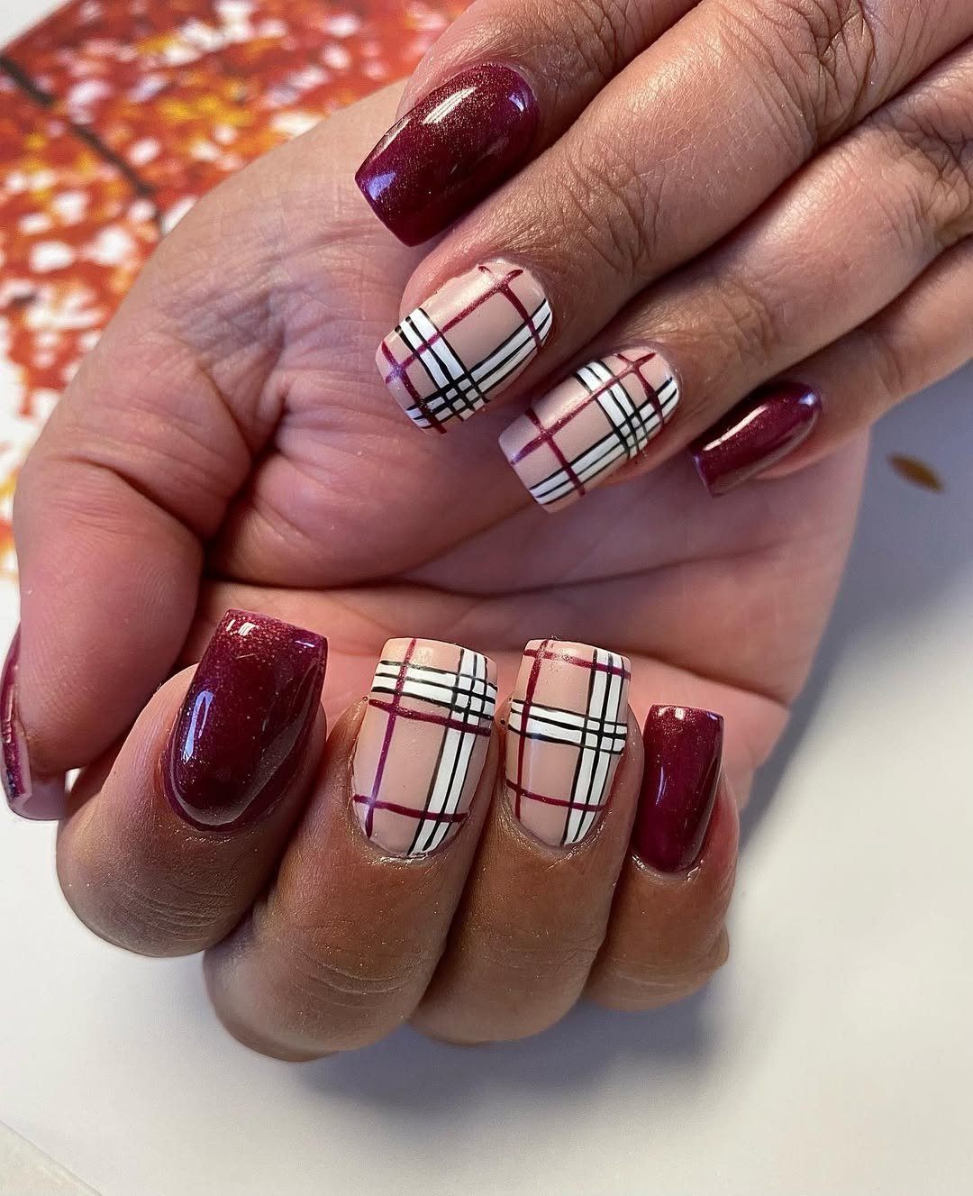 Deep berry tones meet sharp white and black plaid lines in this effortlessly bold combo. It’s that perfect middle ground between festive and wearable—a manicure that could easily live through Thanksgiving into winter without skipping a beat.