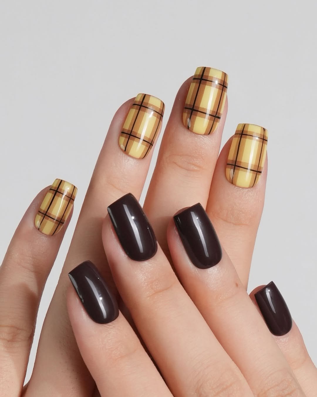 If Thanksgiving were a nail, this would be it. Warm golden plaid against glossy espresso nails strikes a nostalgic note—think pecan pie, flickering candles, and the hum of old records in the background. It’s classic but not cliché.