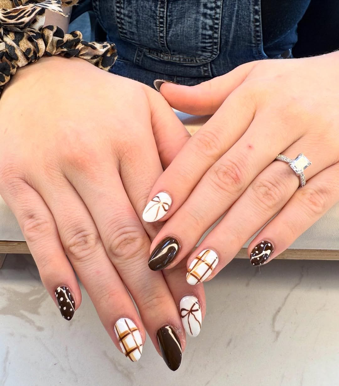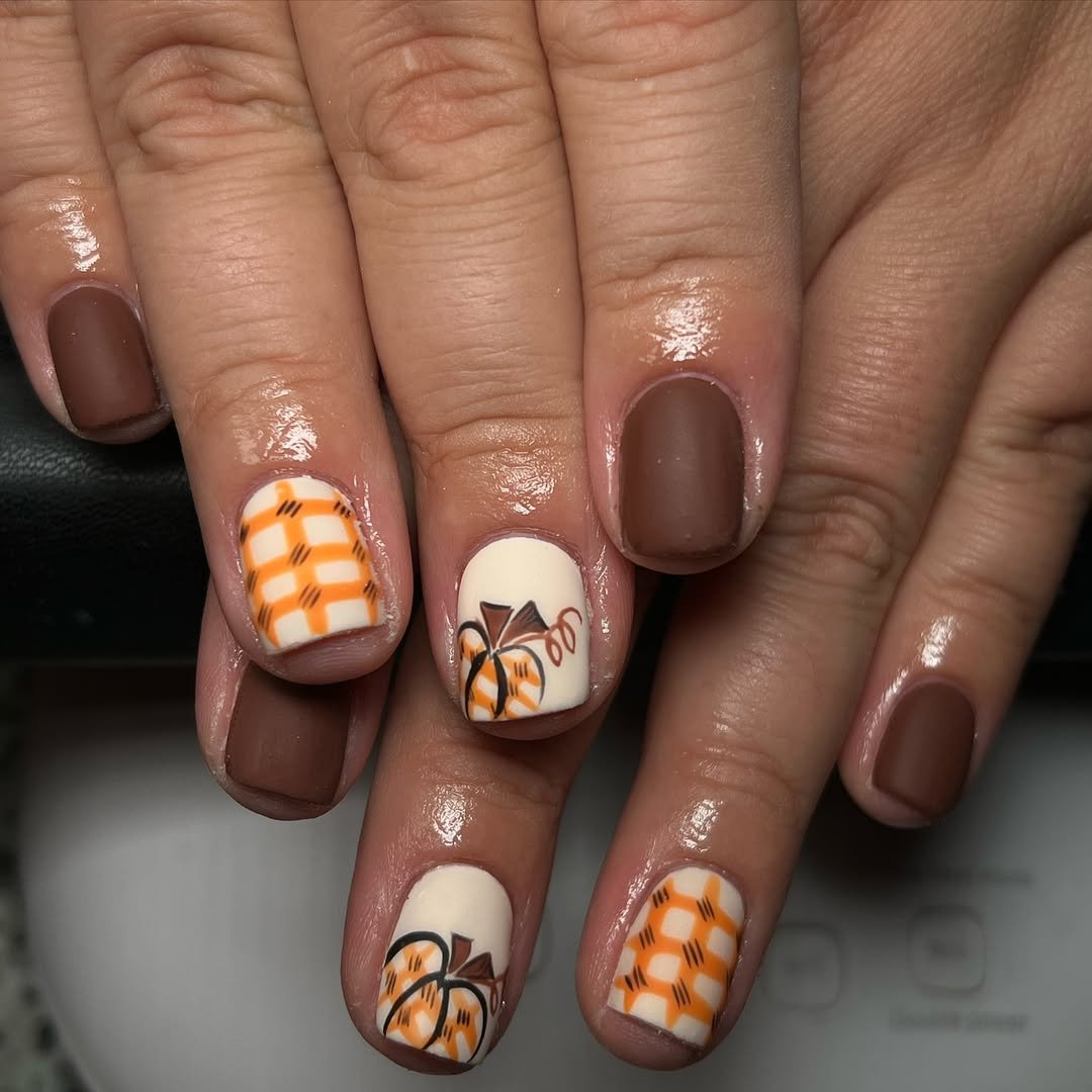 This one’s basically a fall latte in nail form. The warm brown tones and orange-hued grid pattern serve full-on Thanksgiving energy, and the combo of polka dots, solid brown, and clean lines is chef’s kiss for balanced design. It’s playful and polished, like your favorite chunky knit sweater—only it’s living on your hands.