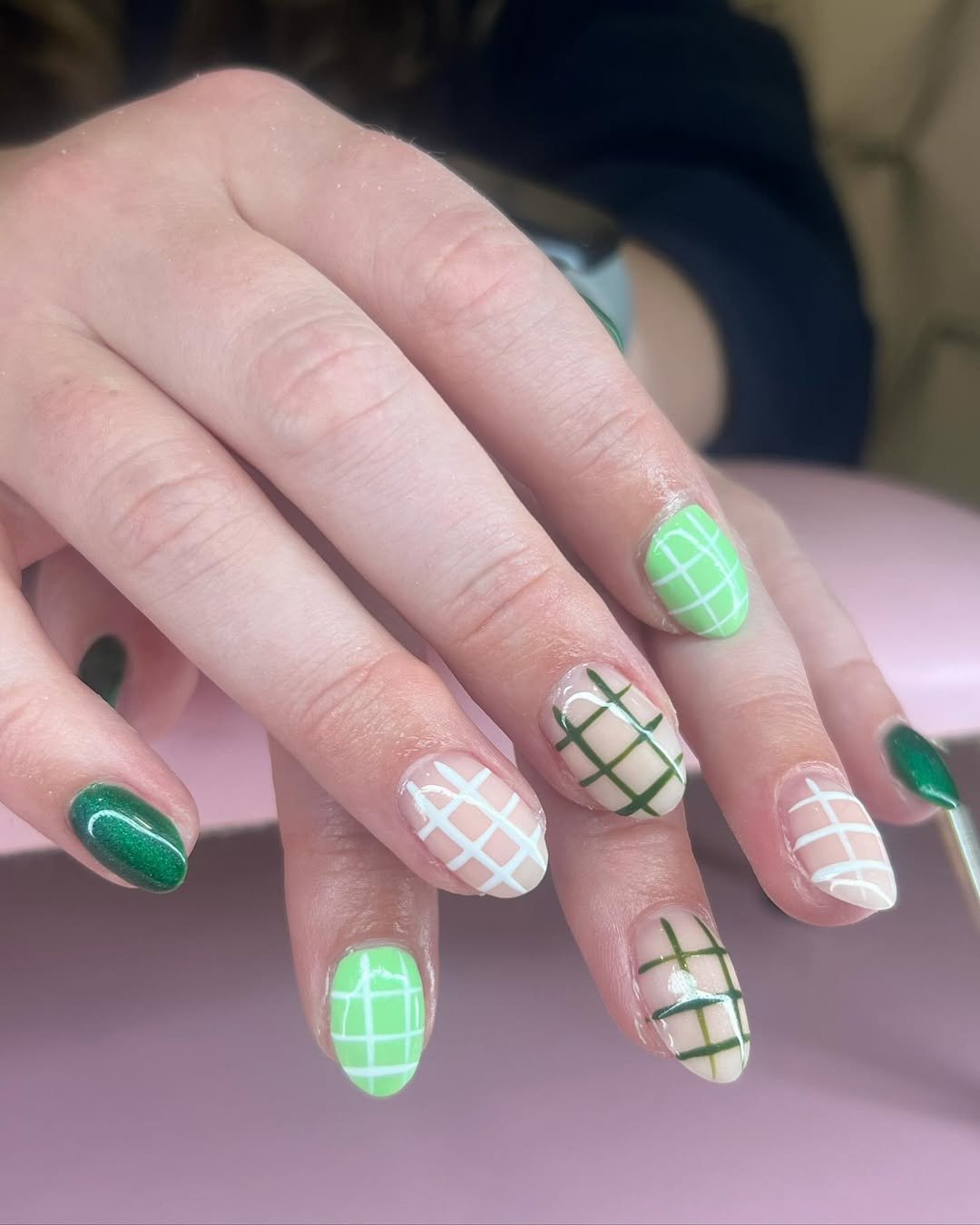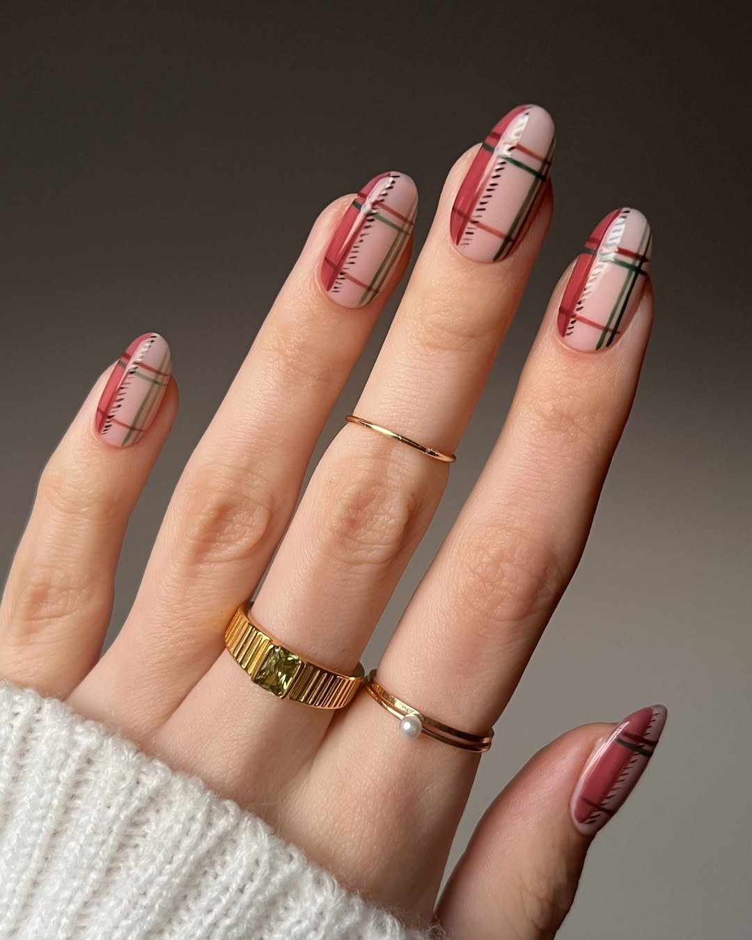 Classic plaid never looked this modern. The soft blush base paired with crisp wine and olive lines feels like a perfect fall sweater translated into polish. There’s just enough spacing between the lines to keep it breathable and sleek, not overly busy.