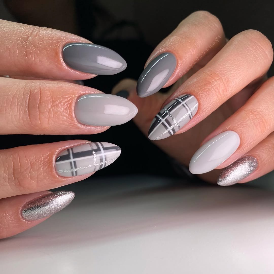 Cool-toned and totally modern, this slate gray plaid set is your neutral-loving heart’s dream. The design is sleek but still cozy—like winter frost on the windowpane if it had an impeccable fashion sense. The silver shimmer accent nails are just the sparkle we need this season.