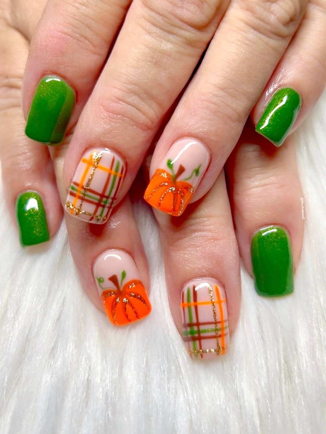 This set by @mrs.nailicious is not shy—it’s bold, bright, and just a little kitschy (but in the cutest way). The combo of vivid green polish and plaid-accented pumpkin art is pure Thanksgiving whimsy, like your favorite family dish got turned into a manicure.