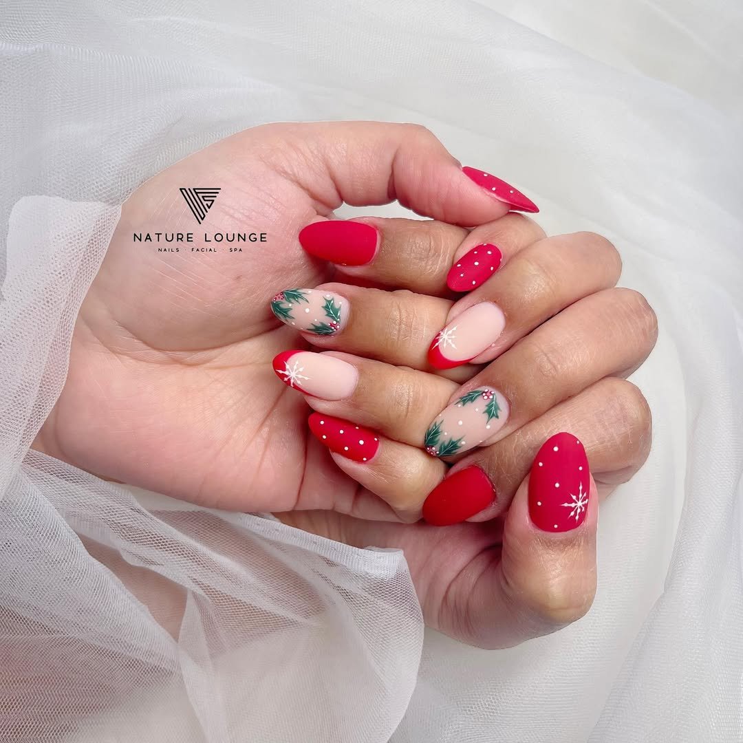 This set doesn’t hold back on festive feels. The matte red base paired with playful polka dots and crisp snowflakes immediately transports you to a snowy cabin wrapped in cozy vibes. Add in the soft blush tones and delicate holly leaves and you’ve got a look that screams Christmas but somehow still whispers elegance. It’s the nail version of a holiday sugar cookie—sweet, classic, and everyone loves it.