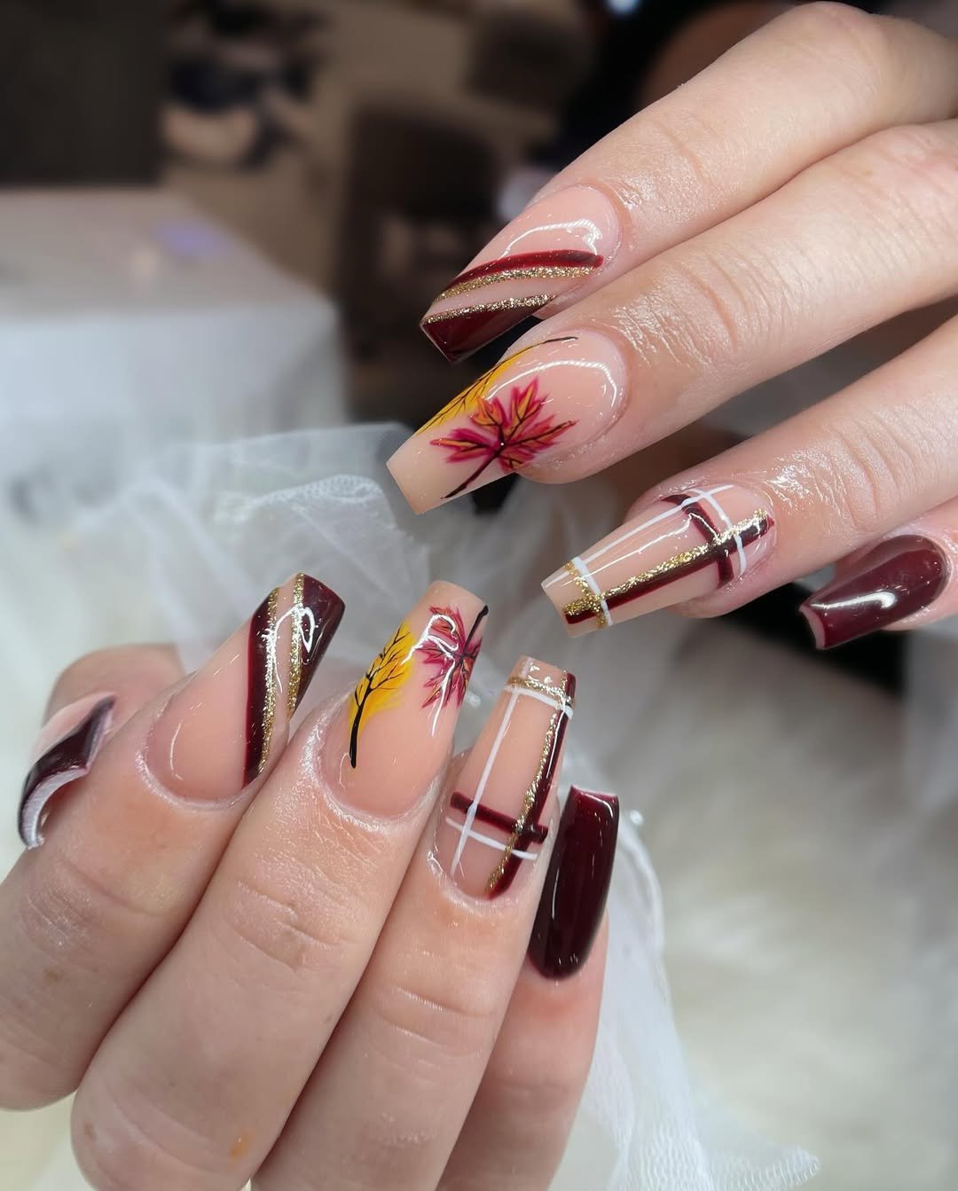 These nails feel like autumn leaves caught in golden hour light. Rich maroon and cocoa tones are layered with delicate white plaid and razor-fine gold striping, adding just the right amount of polish and glamour. But the real show-stealer? That single fiery maple leaf delicately drawn in burnished reds and yellows—it’s like a mini piece of fall foliage art on your fingertips.