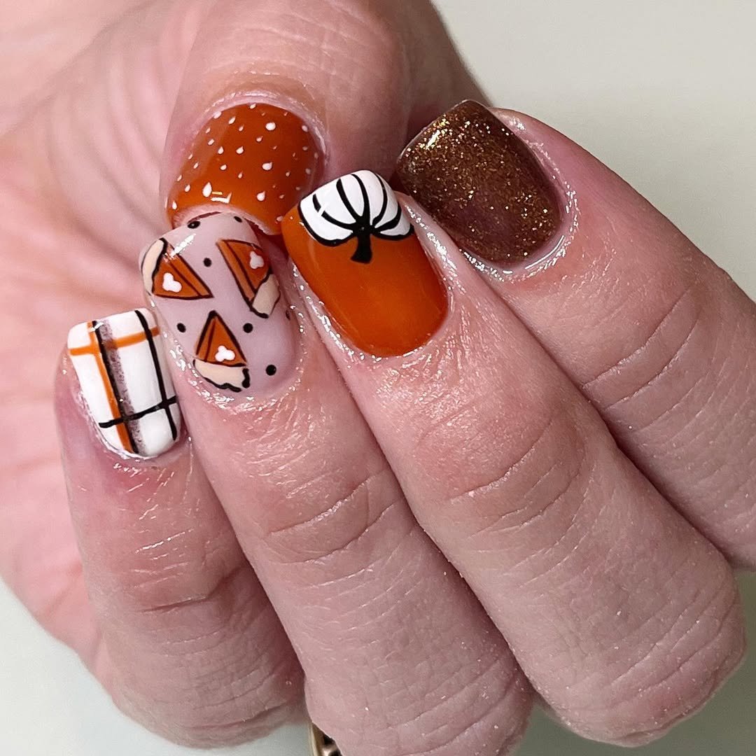 This set by @nailsbyannieb_ is basically Thanksgiving dessert in nail form. We’ve got plaid, pumpkins, glitter, and slices of pie—all done in a mix of rich orange, creamy white, and golden shimmer. It’s playful, a little extra, and 100% delicious.