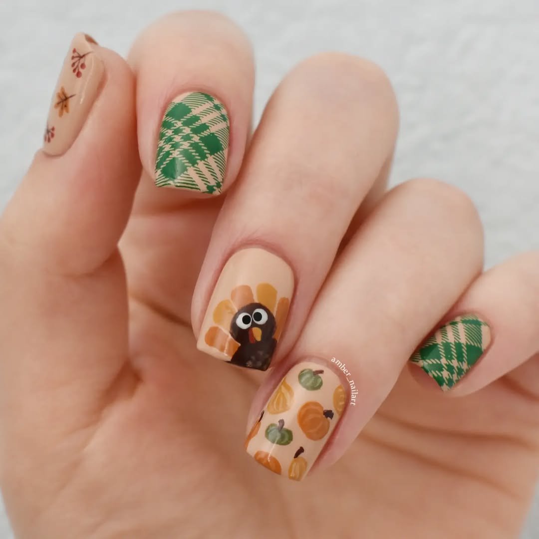 This is Thanksgiving nails, but make them cheeky and charming. The matte finish softens a palette of caramel and sage, while playful plaid checks give a festive nod to cozy knitwear. A cartoon turkey with wide eyes steals the spotlight—equal parts adorable and unexpected.