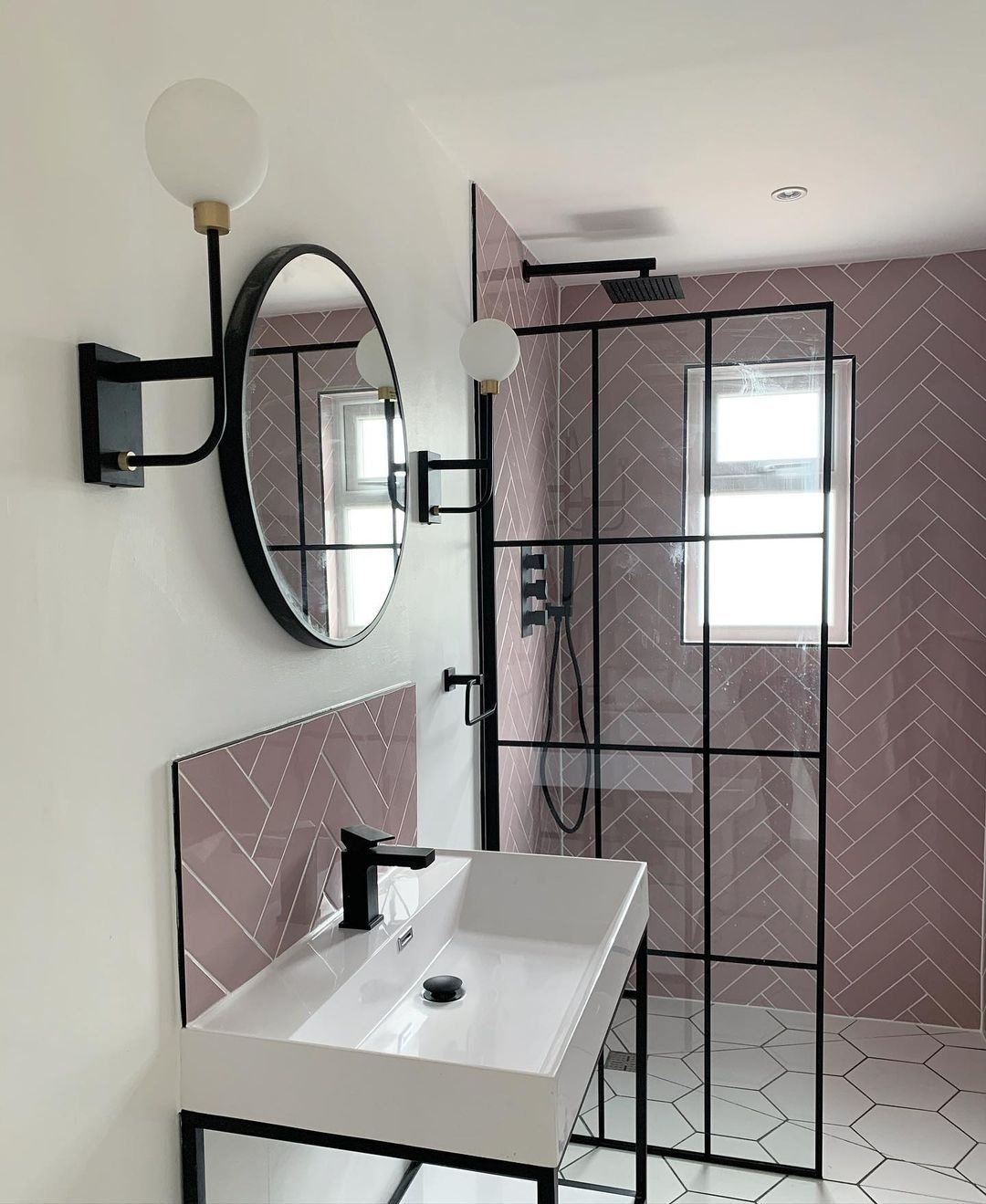 This is where soft meets bold in the best way. The dusty pink tiles bring warmth and personality, while the black grid shower frame sharpens everything up.