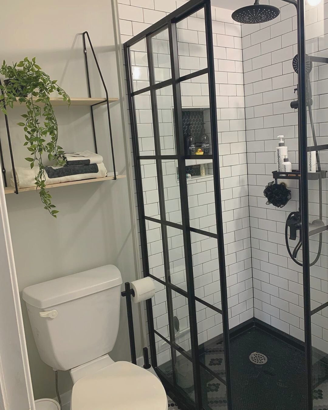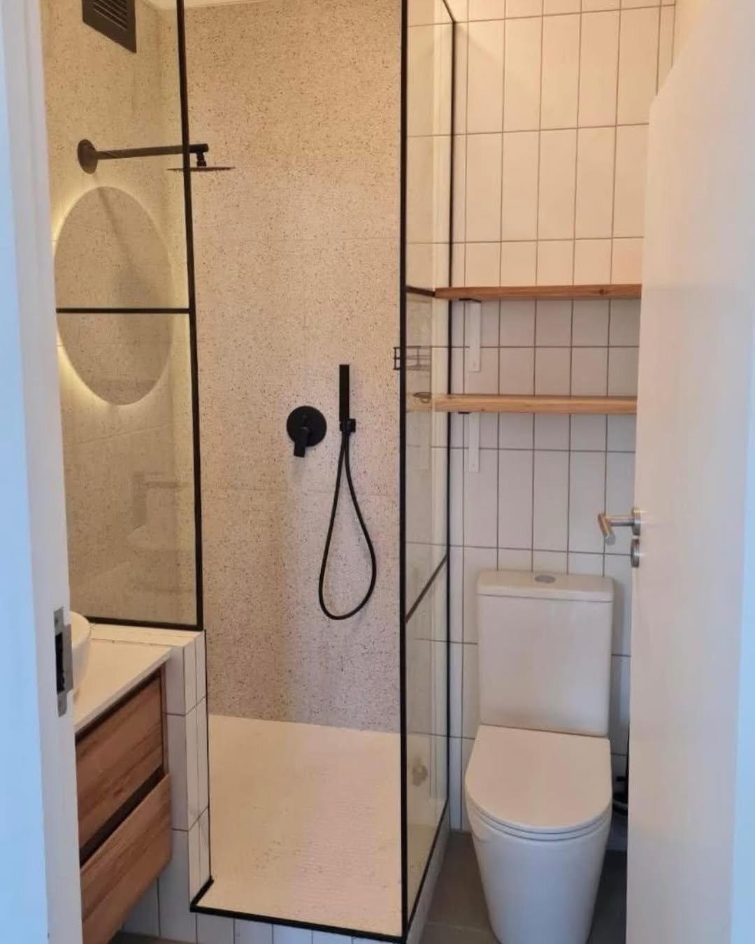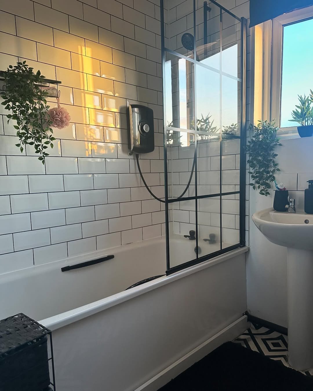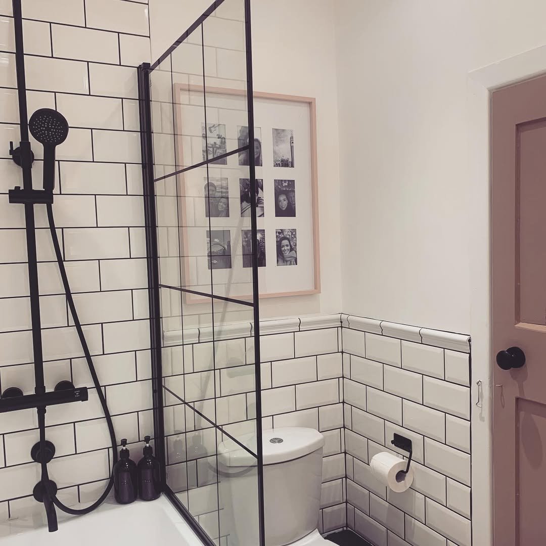 That black grid shower screen is doing a lot of heavy lifting here—and it works. It gives the space structure, a bit of edge, and makes the bathroom feel more designed than just functional.