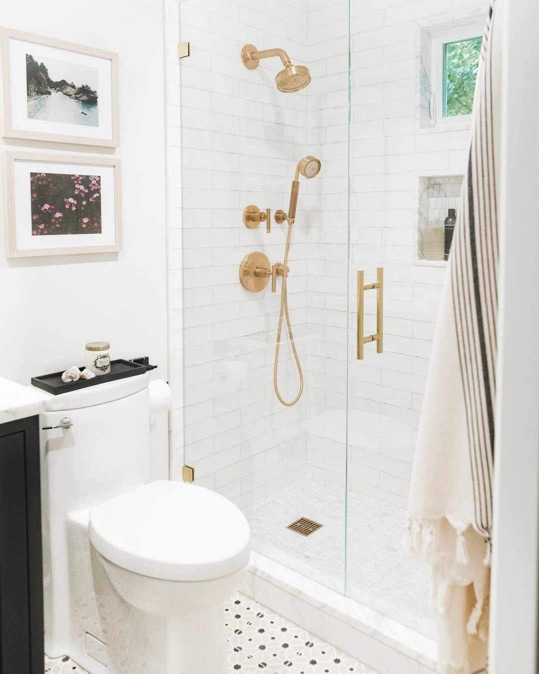 This is how you do storage in a tiny bathroom without making it feel cluttered. The floating shelves add function while still keeping things visually light.