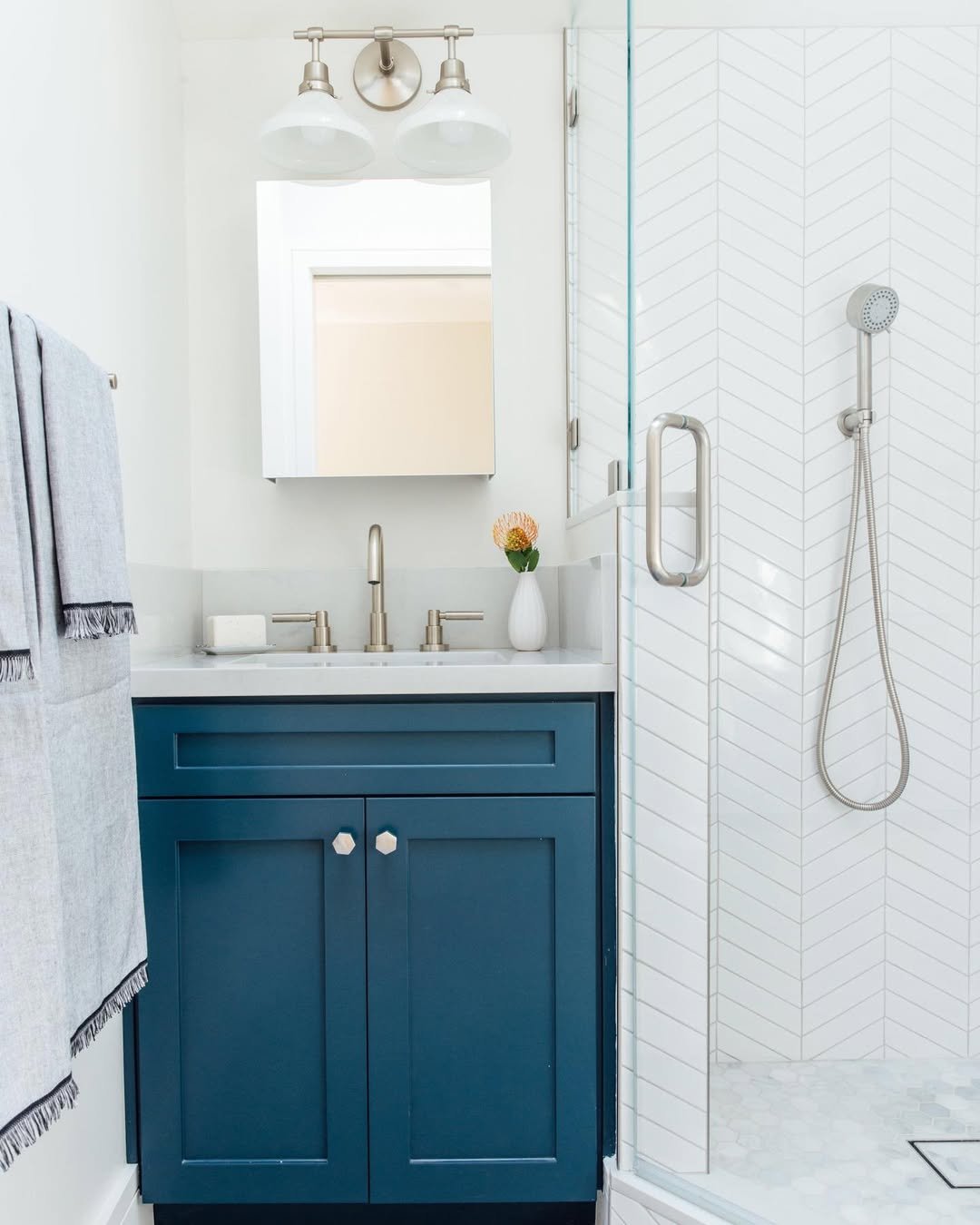 That deep blue vanity is the star here. It grounds the space instantly and adds a richness that small bathrooms often lack.